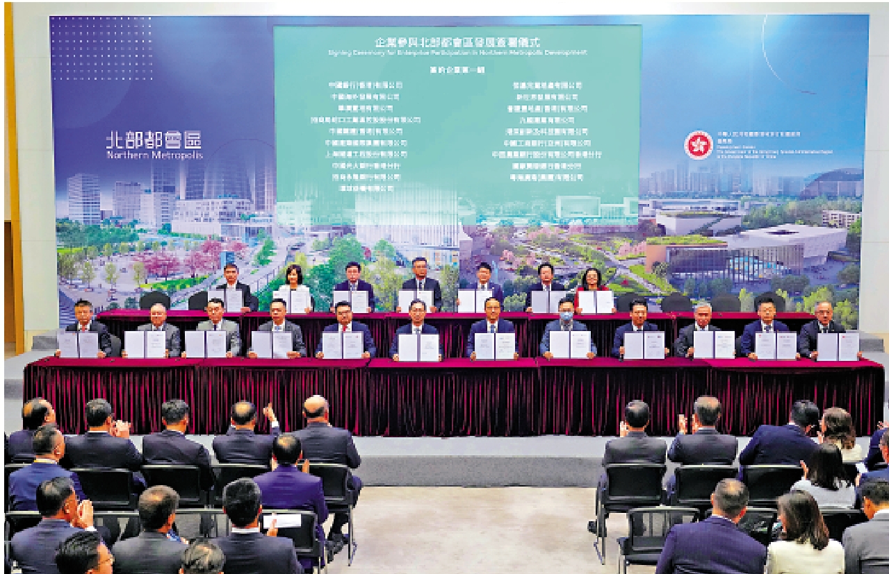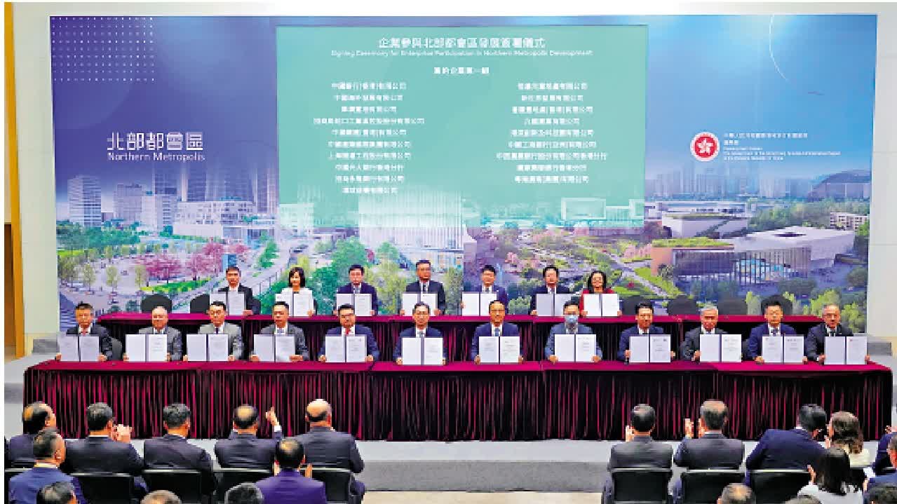 特區政府上月底舉行「企業參與北部都會區發展簽署儀式」,85間企業分批上台簽署「支持及參與北部都會區發展」的一般意向書,包括多家本地地產發展商,以及多家內地龍頭企業,顯示商界對於北都區發展的期盼與重視。