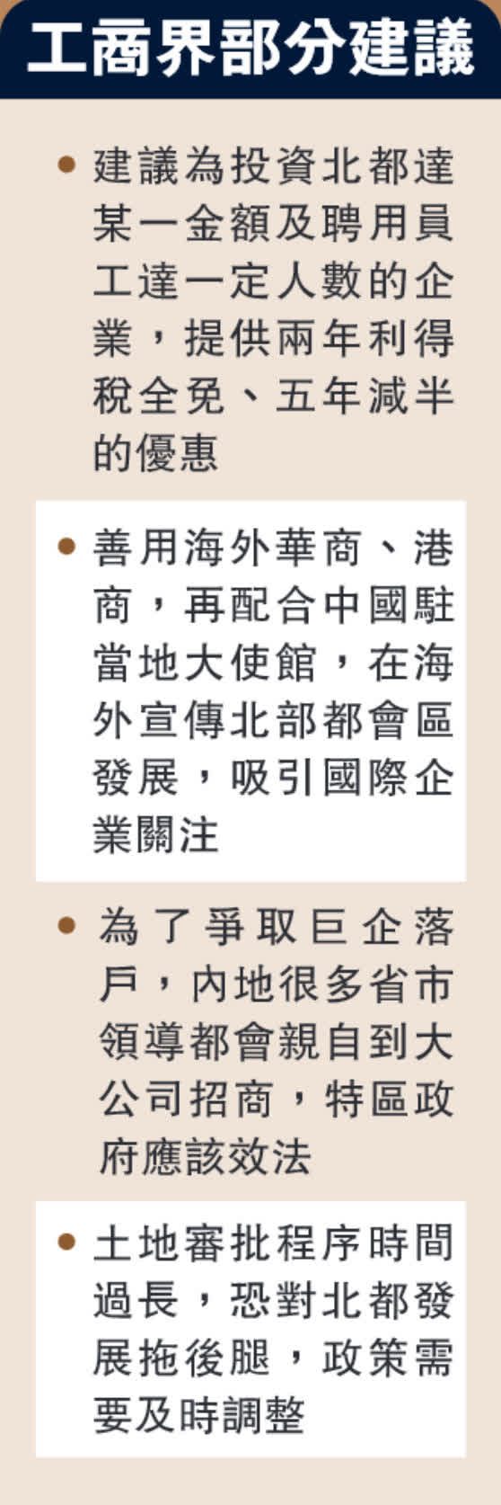 香港中小企經貿促進會會長黃達勝向《大公報》表示,「為了爭取巨企落戶,內地很多省市領導都會親自到大公司招商,特首也應效法。不要一味再強調香港有多少優勢,要詢問對方要什麼條件才肯落戶香港,這才令對方感到受重視。或者直接向企業開出條件,例如指定限期投資達某一金額及聘用員工達一定人數,便可獲兩年利得稅全免、五年減半的優惠,再配合現有支持創科的政策,北都勢必吸引力大增。試想想小米和騰訊有多少分公司,若在中央支持下,再加上超多優惠,說不定能引入更多巨頭及關連公司落戶香港。」他建議特首訪問內地省市時,可化身招商大使,以行動和誠意感動企業來港投資。
