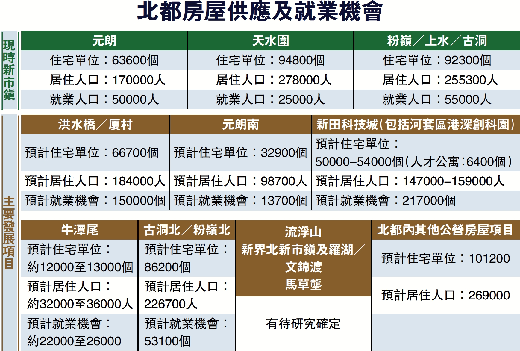 未來的北都不但是香港發展的火車頭、新經濟引擎,更成為連接大灣區各大城市、合作互補的重要平台。整個北都發展成為一個能容納約250萬居住人口,提供約65萬個工作職位,集優質生活、產業發展和文化休閒於一體的都會區,是職住平衡和綠色生活的最佳體驗區和商業區。