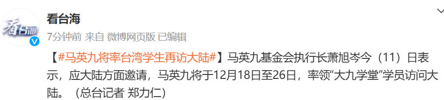 據「看台海」微博消息,馬英九基金會執行長蕭旭岑今日(12月11日)表示,應大陸方面邀請,馬英九將於12月18日至26日,率領「大九學堂」學員訪問大陸。