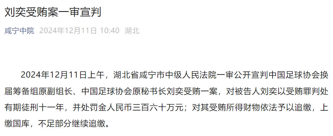據咸寧中院消息,2024年12月11日上午,湖北省咸寧市中級人民法院一審公開宣判中國足球協會換屆籌備組原副組長、中國足球協會原秘書長劉奕受賄一案,對被告人劉奕以受賄罪判處有期徒刑十一年,並處罰金人民幣三百六十萬元;對其受賄所得財物依法予以追繳,上繳國庫,不足部分繼續追繳。