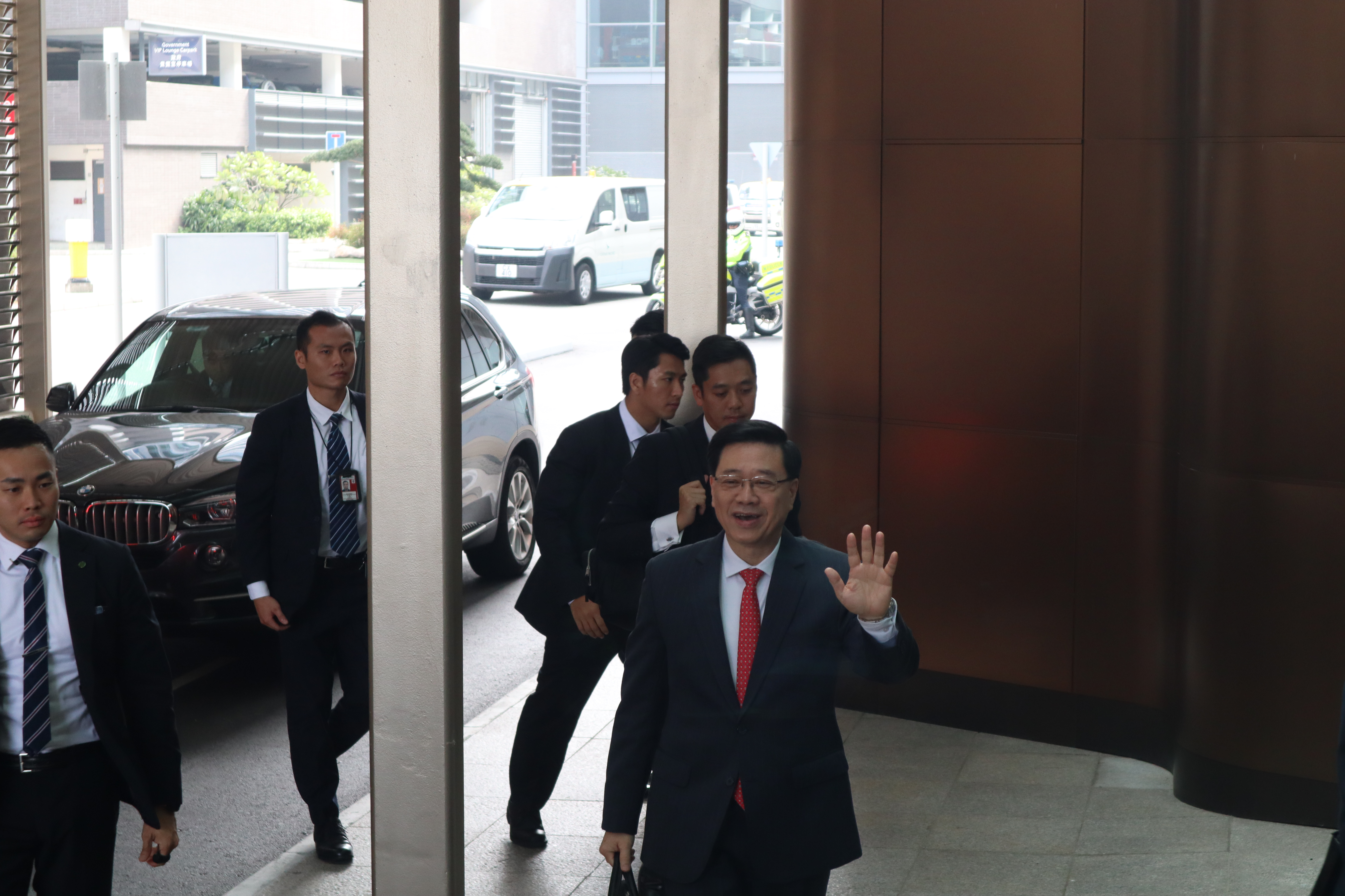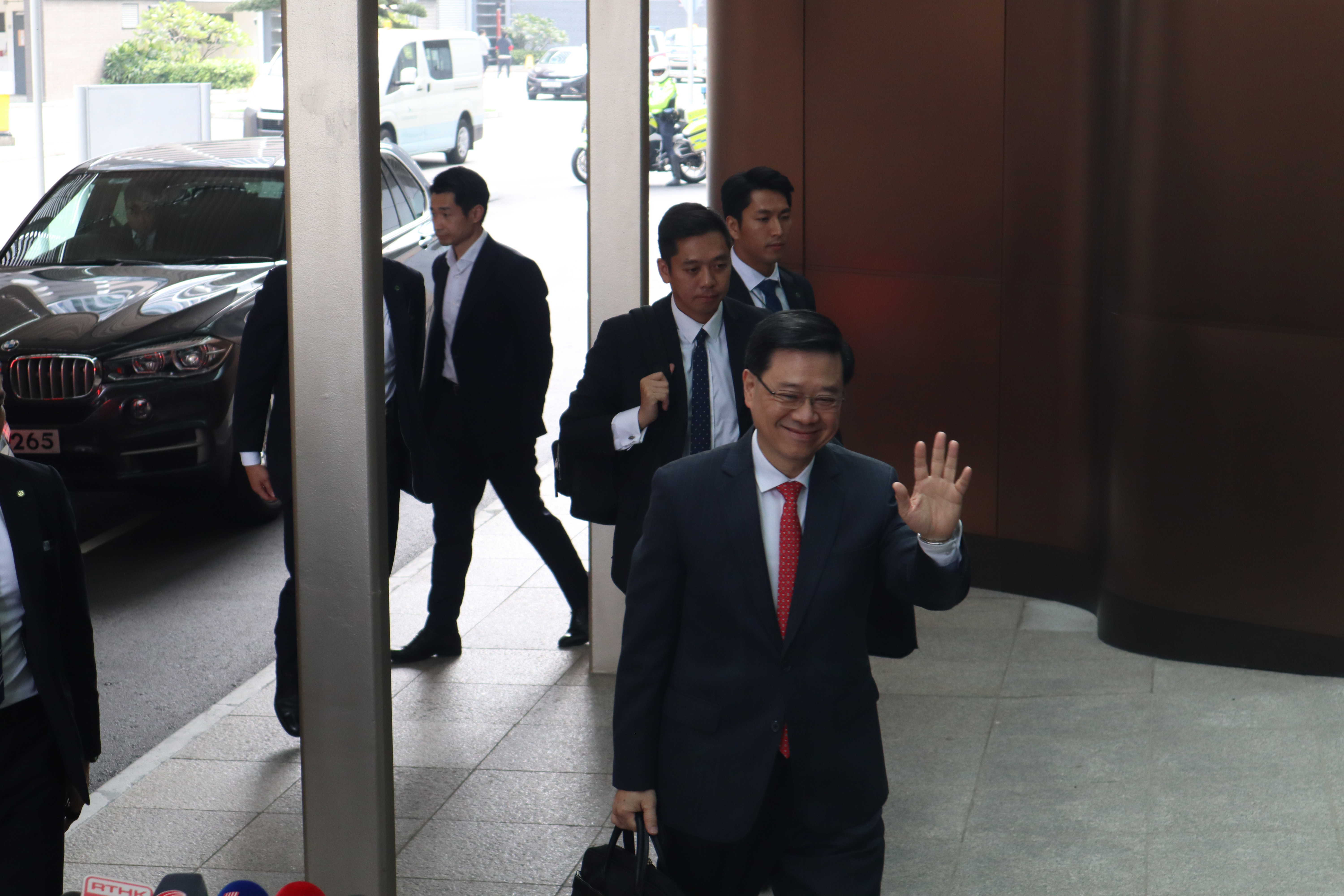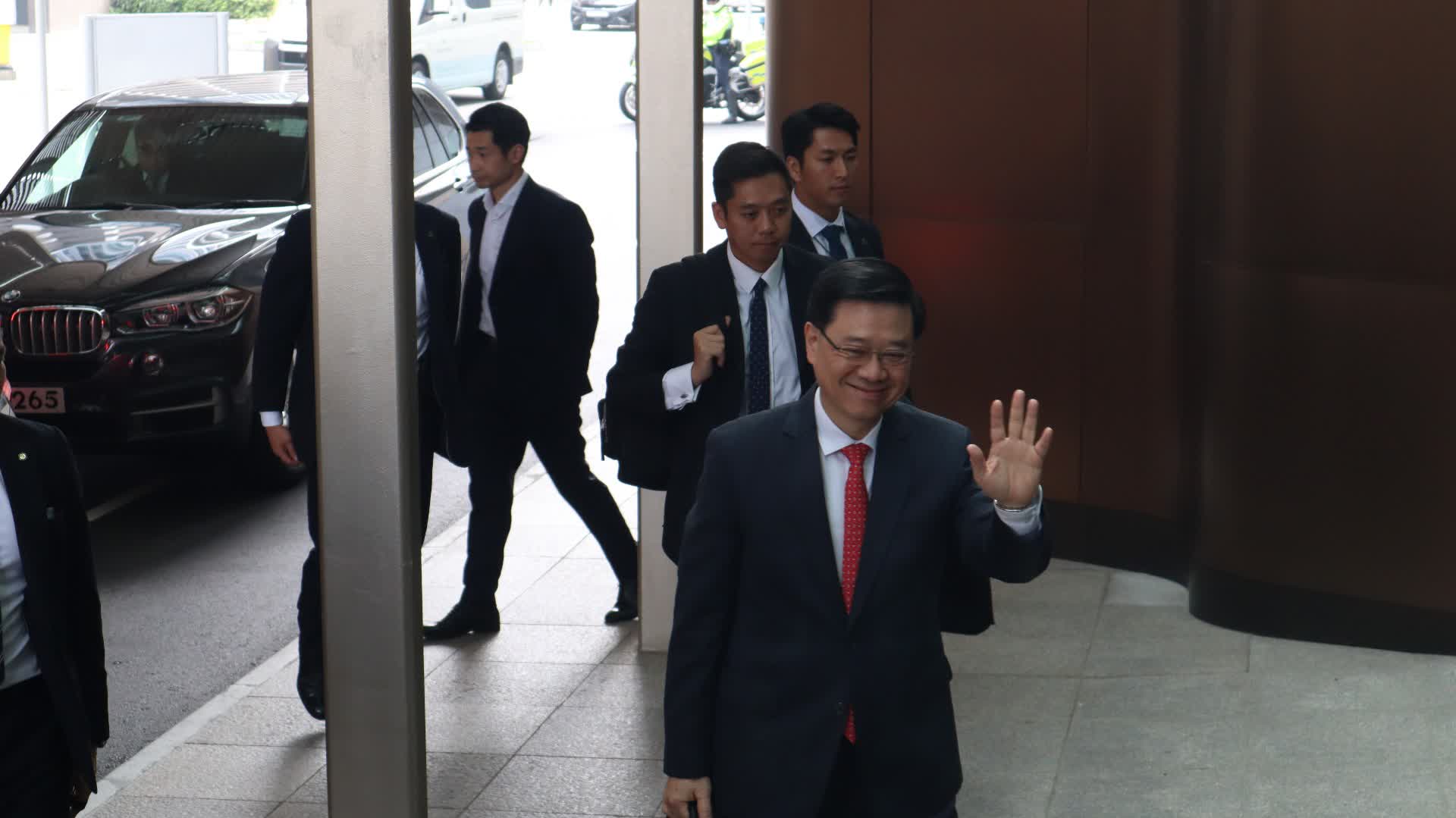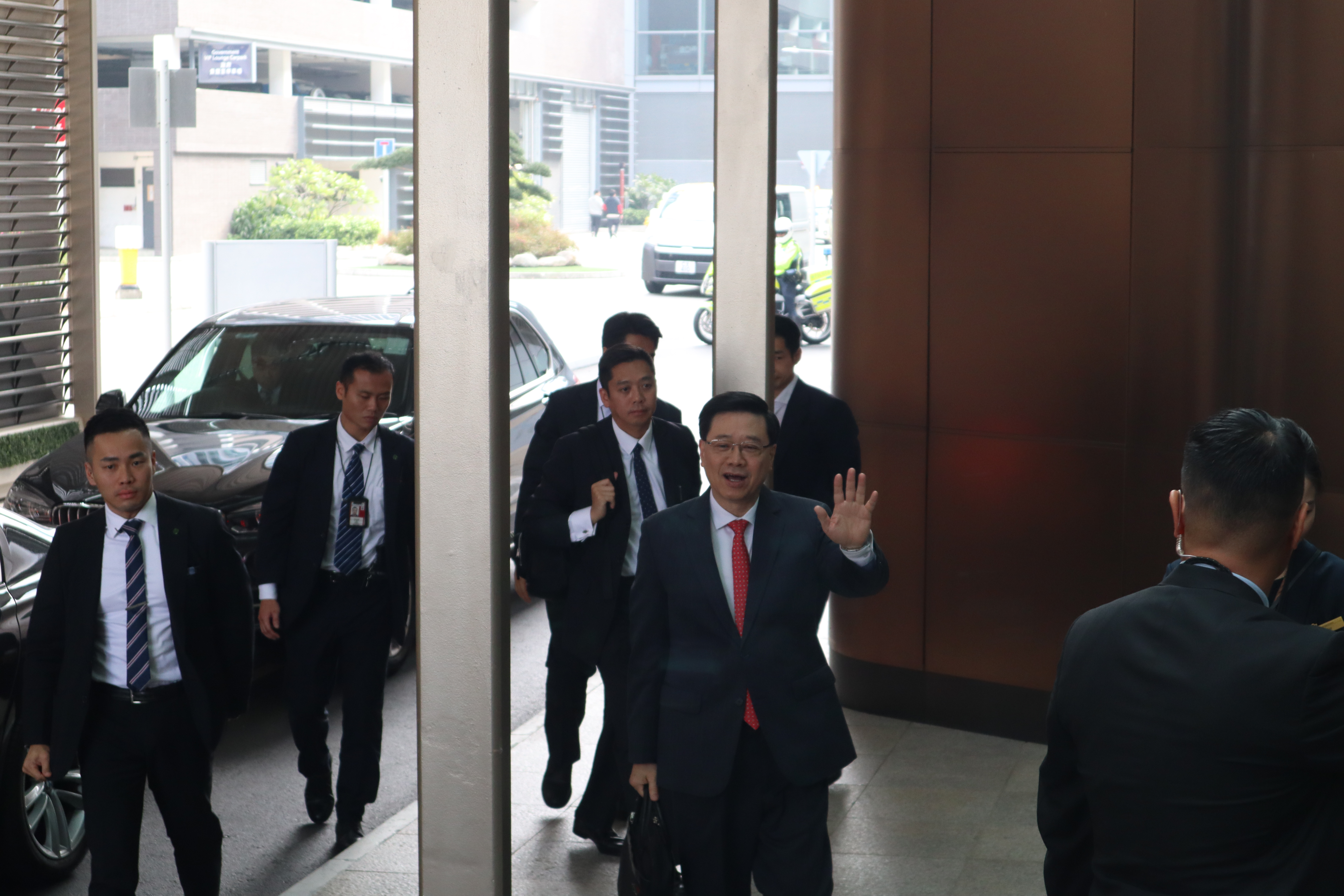 (大公文匯全媒體 記者 李九歌)行政長官李家超今日(11日)赴北京述職。他今午抵達香港國際機場,身着深藍色西裝,紅色呔奪目,落車後同傳媒打招呼。現場雖設採訪區,但特首未接受採訪,徑直步入機場未作停留。