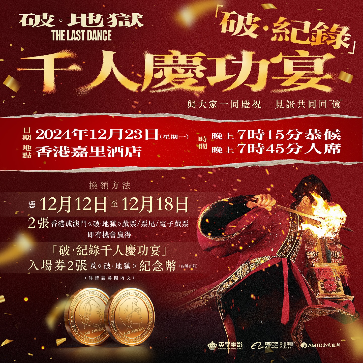 市民可憑12月12日至12月18日兩張香港或澳門《破·地獄》戲票/票尾/電子戲票,並以300字內寫一封信「給我的『珍寶』」,即有機會贏得慶功宴入場券2張及《破·地獄》紀念幣,名額有限,抓緊參與!