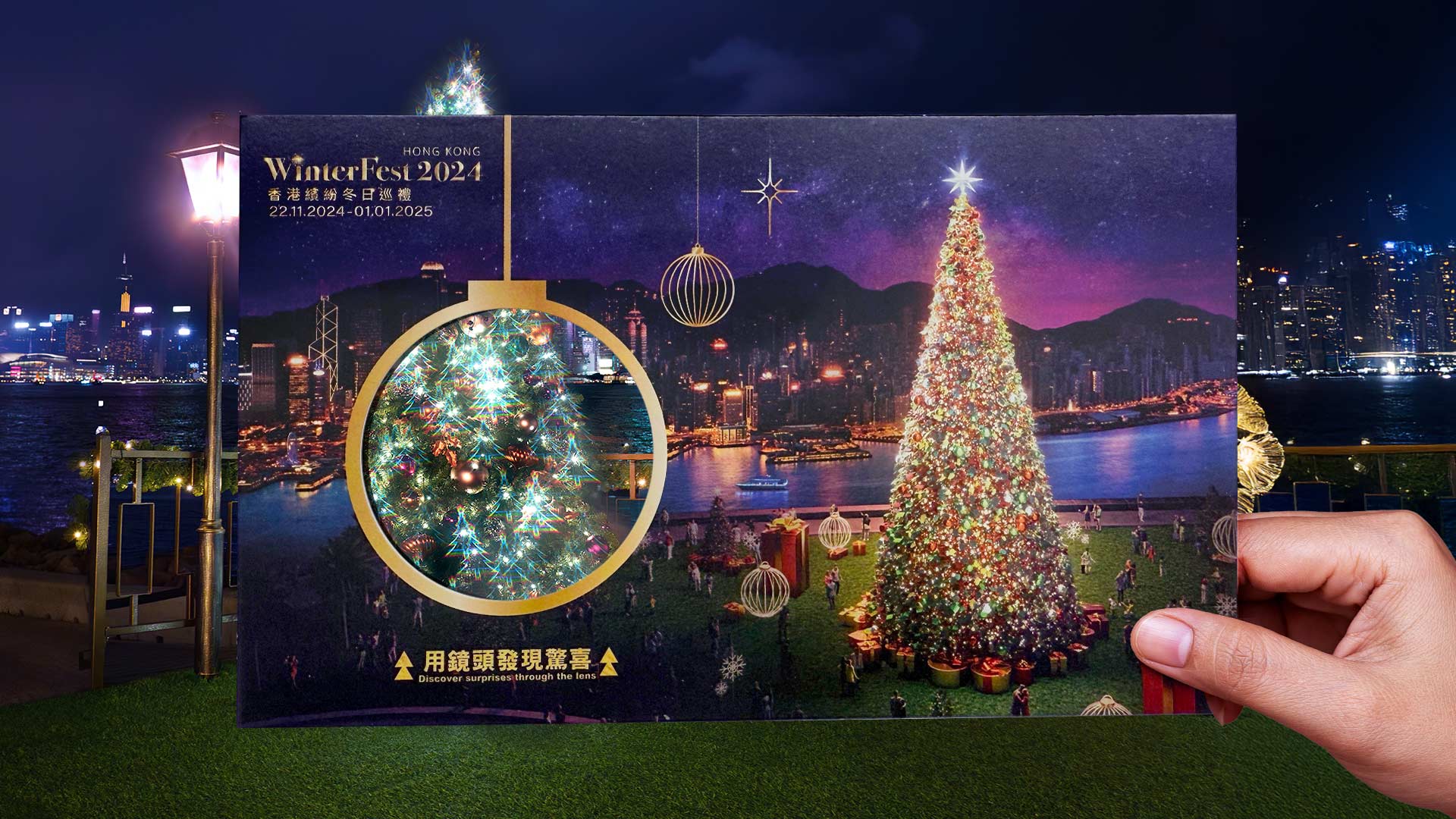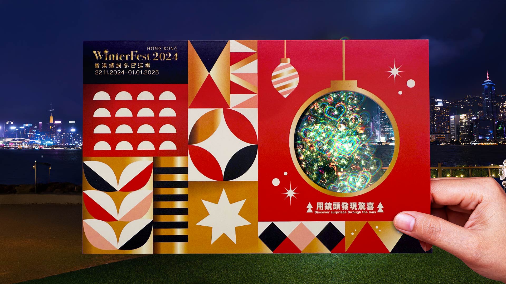 旅發局設計聖誕主題明信片,讓你寫下祝福送給親友,其中一款以聖誕小鎮為主題,另一款則以聖誕禮物包裝為主調。明信片上還設有濾鏡片,透過它觀賞燈飾時,光點會變幻成聖誕樹和愛心圖案,配合手寫祝福,為親友寄送暖心驚喜。