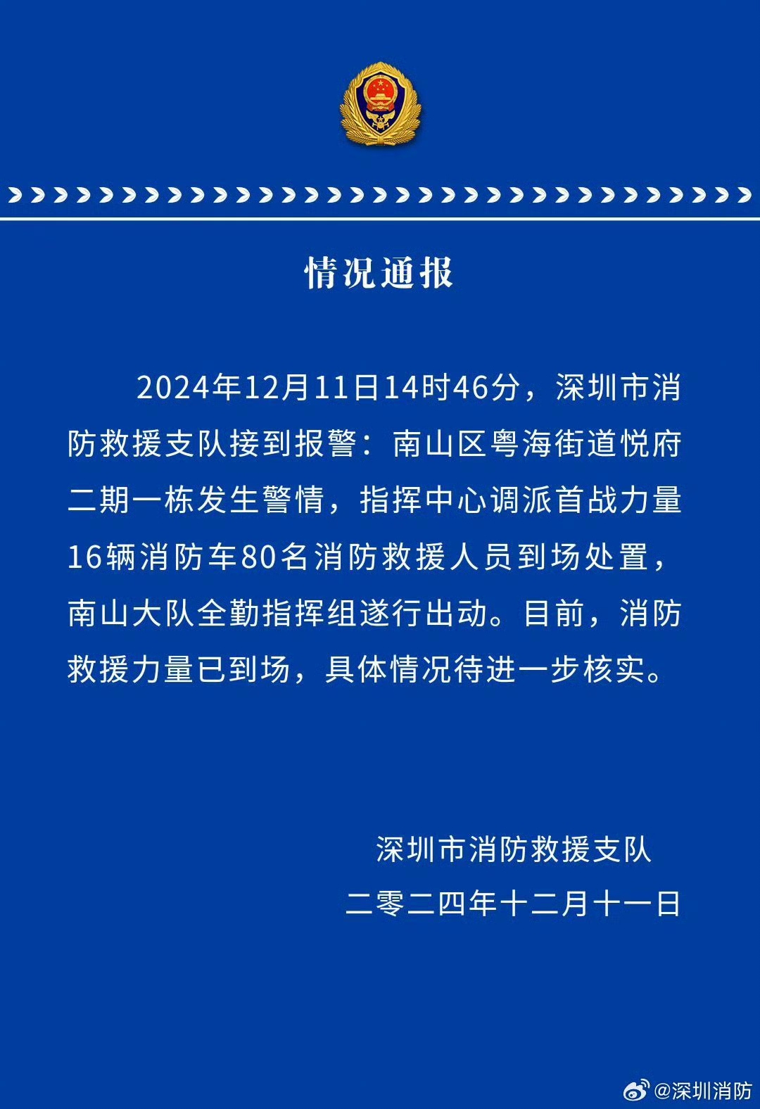 據官方通報,12月11日下午2時46分,深圳市消防救援支隊接到報警指,深圳市南山區粵海街道悅府二期一棟發生警情,指揮中心調派首戰力量16輛消防車80名消防救援人員到場處置南山大隊全勤指揮組遂行出動。目前,消防救援力量已到場,具體情況待進一步核實。