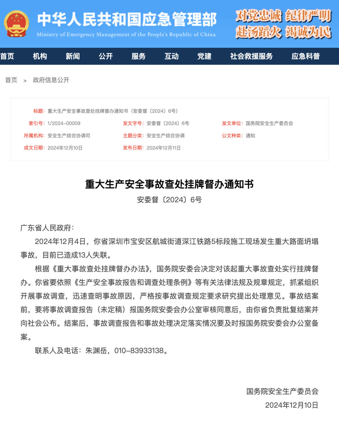 通知書指出,2024年12月4日,深圳市寶安區航城街道深江鐵路5標段施工現場發生重大路面坍塌事故,目前已造成13人失聯。