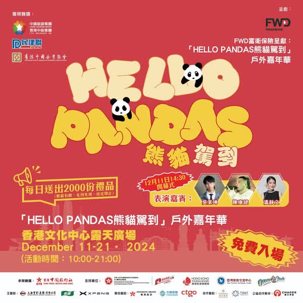 (大公文匯全媒體 記者 陳子萌)大熊貓主題「HELLO PANDAS 熊貓駕到」戶外嘉年華今日(11日)起至12月21日在香港文化中心露天廣場舉行,設有市集、熊貓藝術裝置、表演節目,費用全免。10米高水上巨型大熊貓氣模藝術裝置是今次重頭戲之一,首次亮相尖沙咀海旁,勢必燃爆全港歡樂氣氛。主辦方預期活動可吸引超過100萬人次入場。