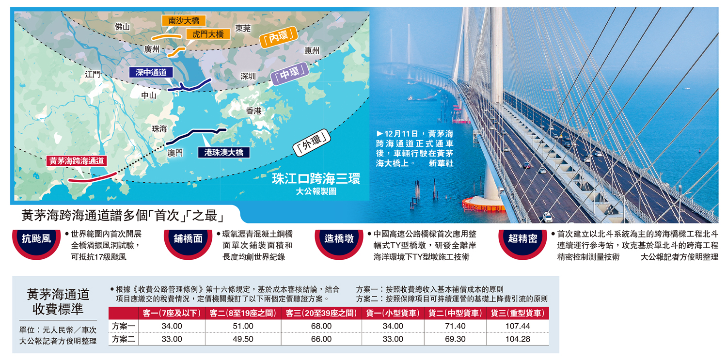(大公報記者方俊明整理)繼港珠澳大橋、深中通道之後,粵港澳大灣區又一跨海通道重大工程「黃茅海跨海通道」11日通車試運營,再添「關鍵一橫」,使港珠澳通道向西「拉直」,形成「香港──澳門──珠海──江門──粵西」大通道,將粵港澳大灣區三大極點中的港深極點、澳珠極點與珠江西岸、粵西地區連成一線,承東啟西,方便港澳人士赴粵西工作生活和旅遊。黃茅海跨海通道海上主橋可抵抗17級颱風。