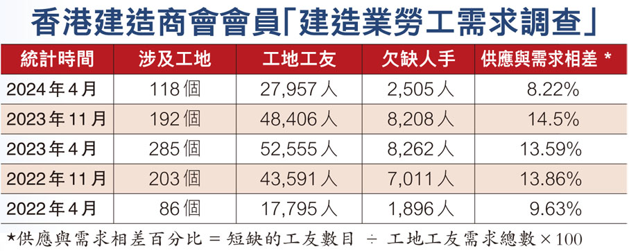 香港建造商會於今年4月發布的調查顯示,調查當日有27,957名工人工作,出缺崗位有2,505個,供應與需求相差8.22%,推算當日全港工地欠缺11,360人。工人人手短缺情況較對上一次調查有輕微改善,對上一次調查當日有48,406名工人工作,欠缺8,208人,供應與需求相差14.5%,該會推算當日全港工地欠缺18,431人。