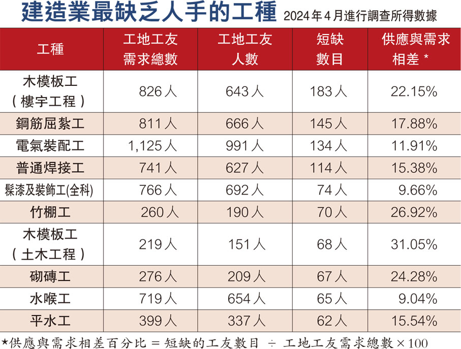 建造商會表示,調查顯示,木模板工(樓宇工程)為最缺乏人手的工種,短缺人數為183人,供應與需求相差達22.15%,其次是鋼筋屈紮工短缺人數為145人,供應與需求相差達17.88%,電氣裝配工的短缺人數為134人,供應與需求亦相差達11.91%。