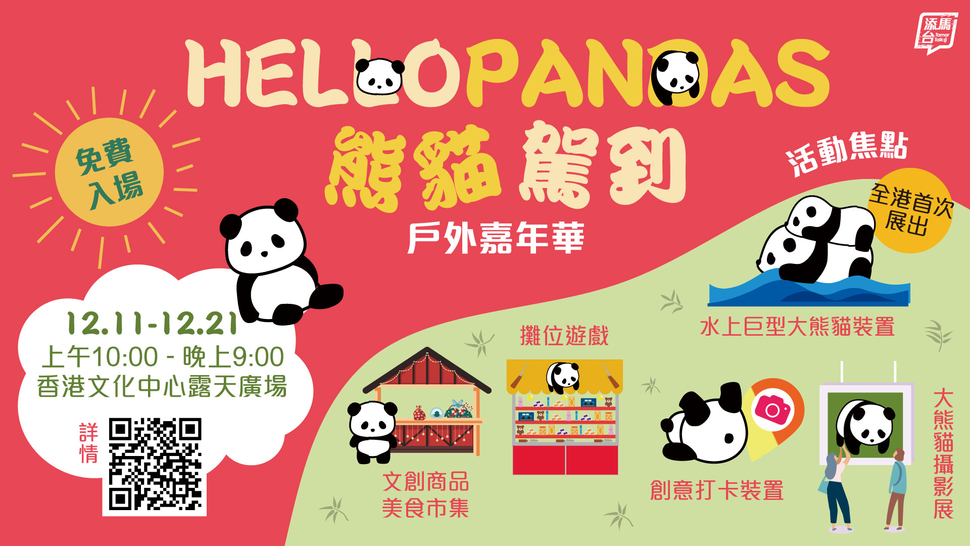 熊貓熱潮停不了!「HELLO PANDAS 熊貓駕到」户外嘉年華由即日起至12月21日在香港文化中心露天廣場舉行,設有陸上和海上大熊貓裝置、互動表演、文創市集、攝影展覽等,免費入場。喜愛大熊貓的你,請勿錯過!