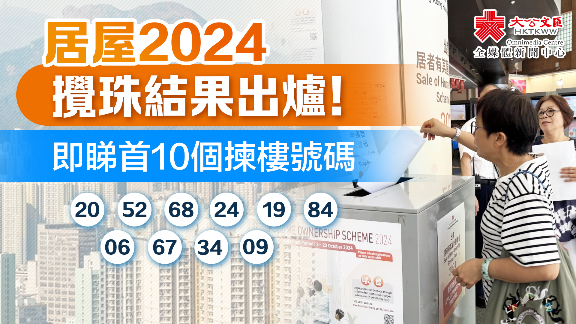 大公文匯全媒體報道,「出售居者有其屋計劃單位2024」(居屋2024)今日(12日)上午10時30分舉行攪珠儀式,以決定「居屋2024」申請者按其申請編號最後兩個數字而定的先後次序。首十個揀樓號碼現已出爐,順序分別是20、52、68、24、19、84、06、67、34、09,申請者會按申請編號最後兩個數字,決定揀樓先後次序。