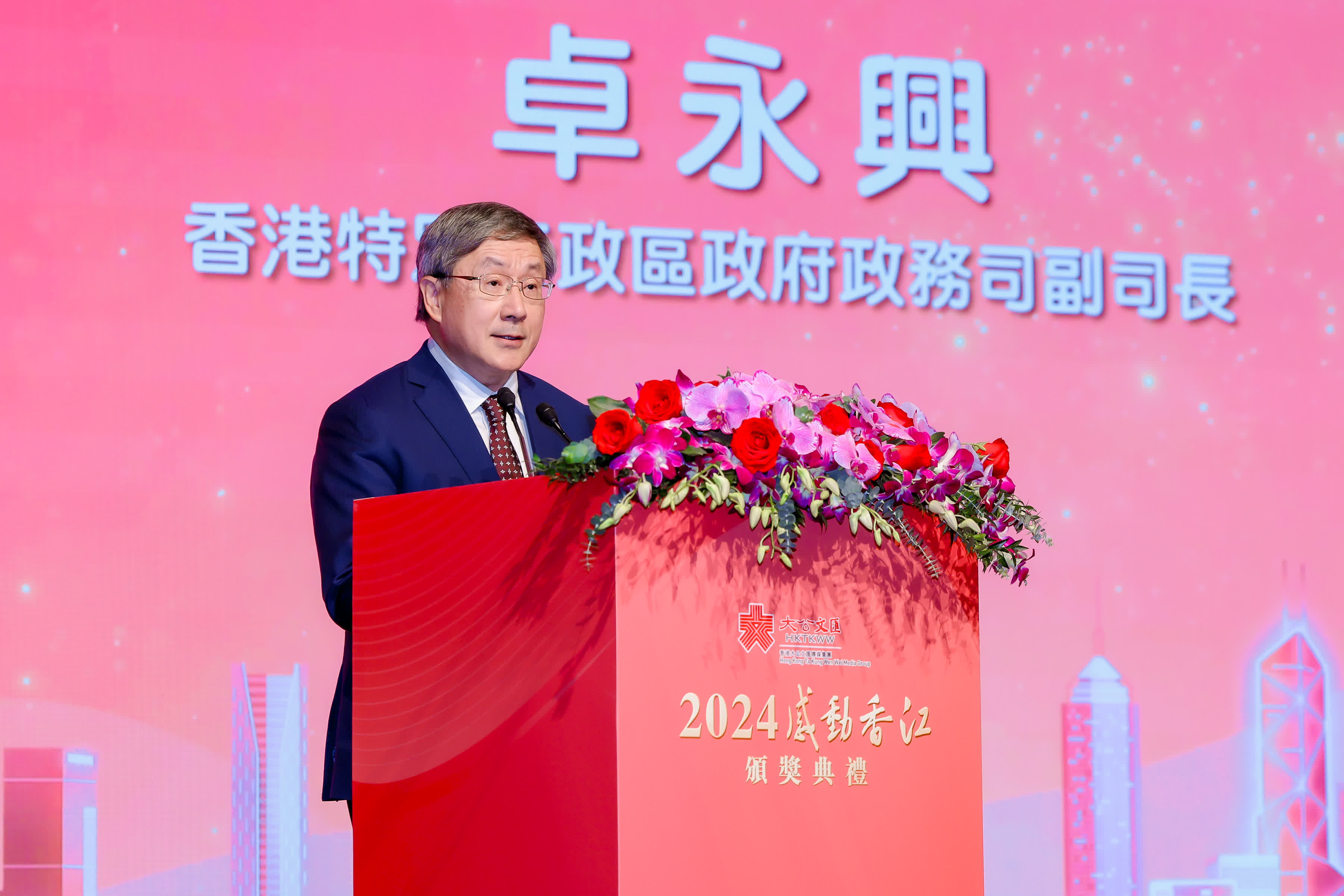 大公文匯全媒體報道,「2024感動香江」頒獎典禮今日(12日)假香港君悅酒店隆重舉行,大會頒發多個「感動香江團體」「感動香江人物」及「感動香江特別致敬」獎項,以表彰香港深具正能量、感動人心的團體及人物,包括對香港社會進步作出傑出貢獻者、自強不息卓越表現者、引領現代社會優良價值觀者、傳承發揚中國傳統美德者等。政務司副司長卓永興出席典禮,他在致辭時表示,對得獎者和團體默默付出、忘我奉獻的精神深感敬佩並高度讚賞。