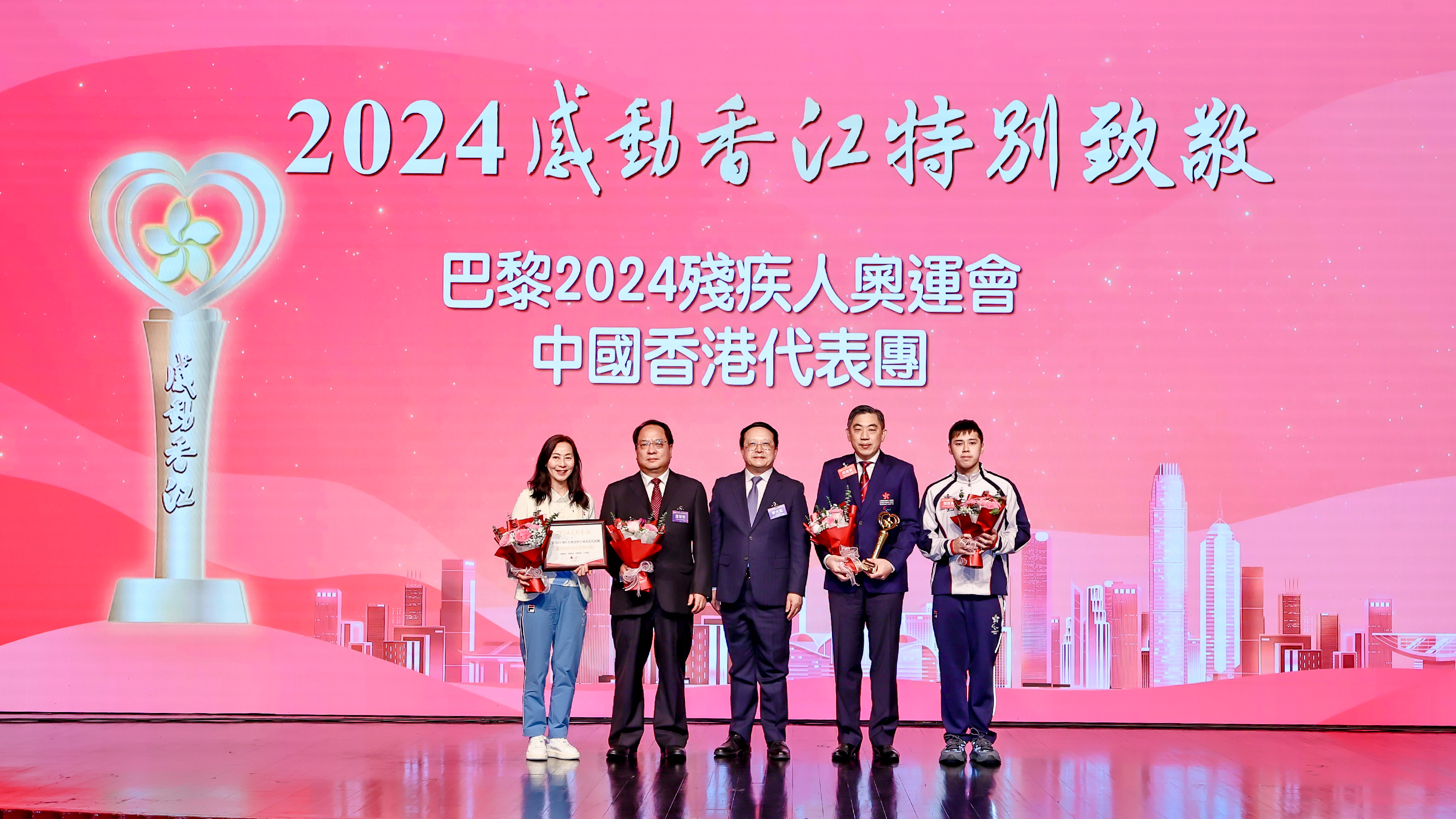 頒獎禮又公布「2024感動香江特別致敬」獎項另一獲獎團體——巴黎2024殘疾人奧運會中國香港代表團。在巴黎殘疾人奧運會上,港隊代表團除了帶給市民激動之外,還有感動,因為他們在賽場上需要用超乎常人的毅力,才能打破身體的極限,去粉碎命運的桎梏,他們的每一個舉動都讓市民動容,因為他們自強不息,遇強愈強。