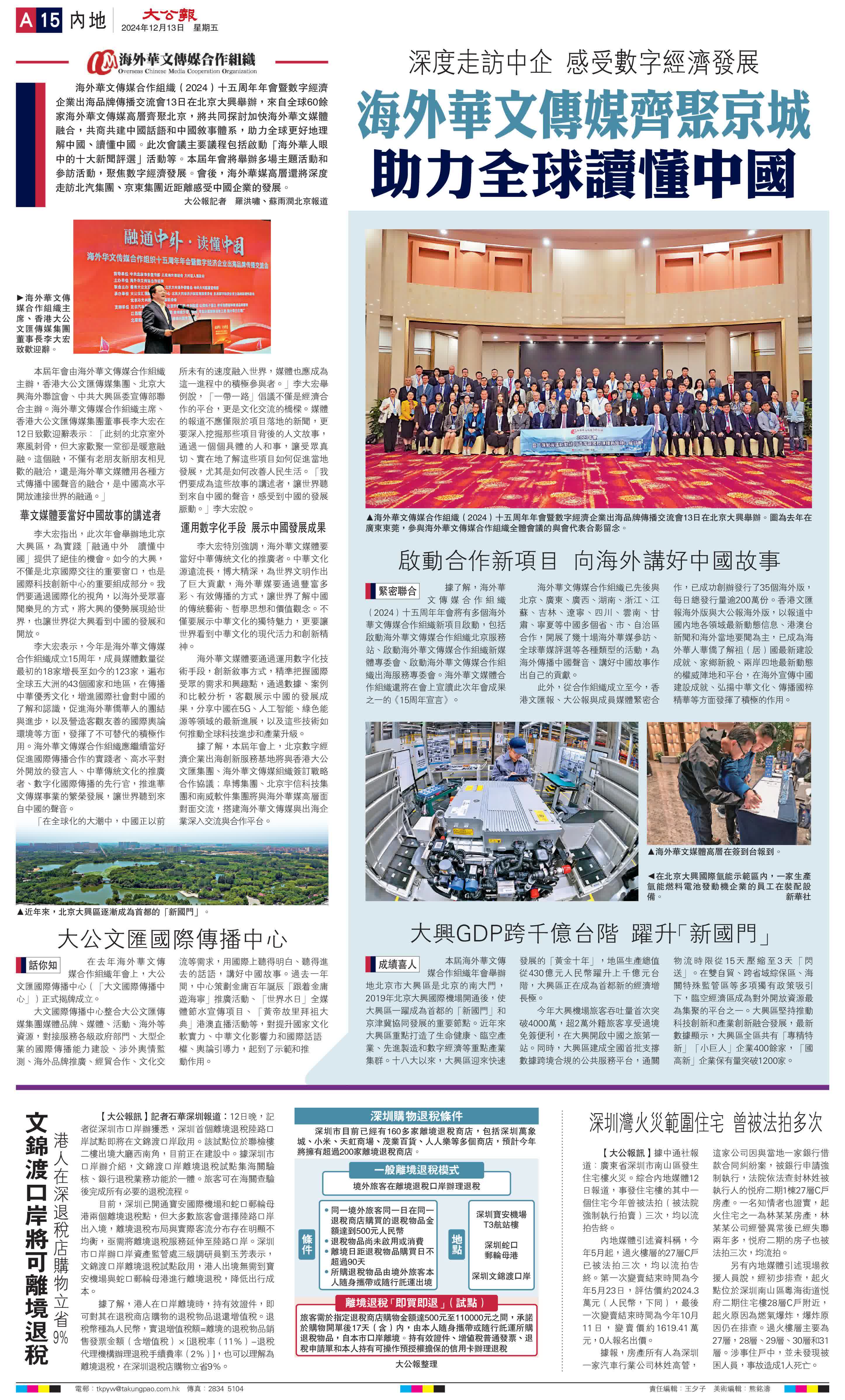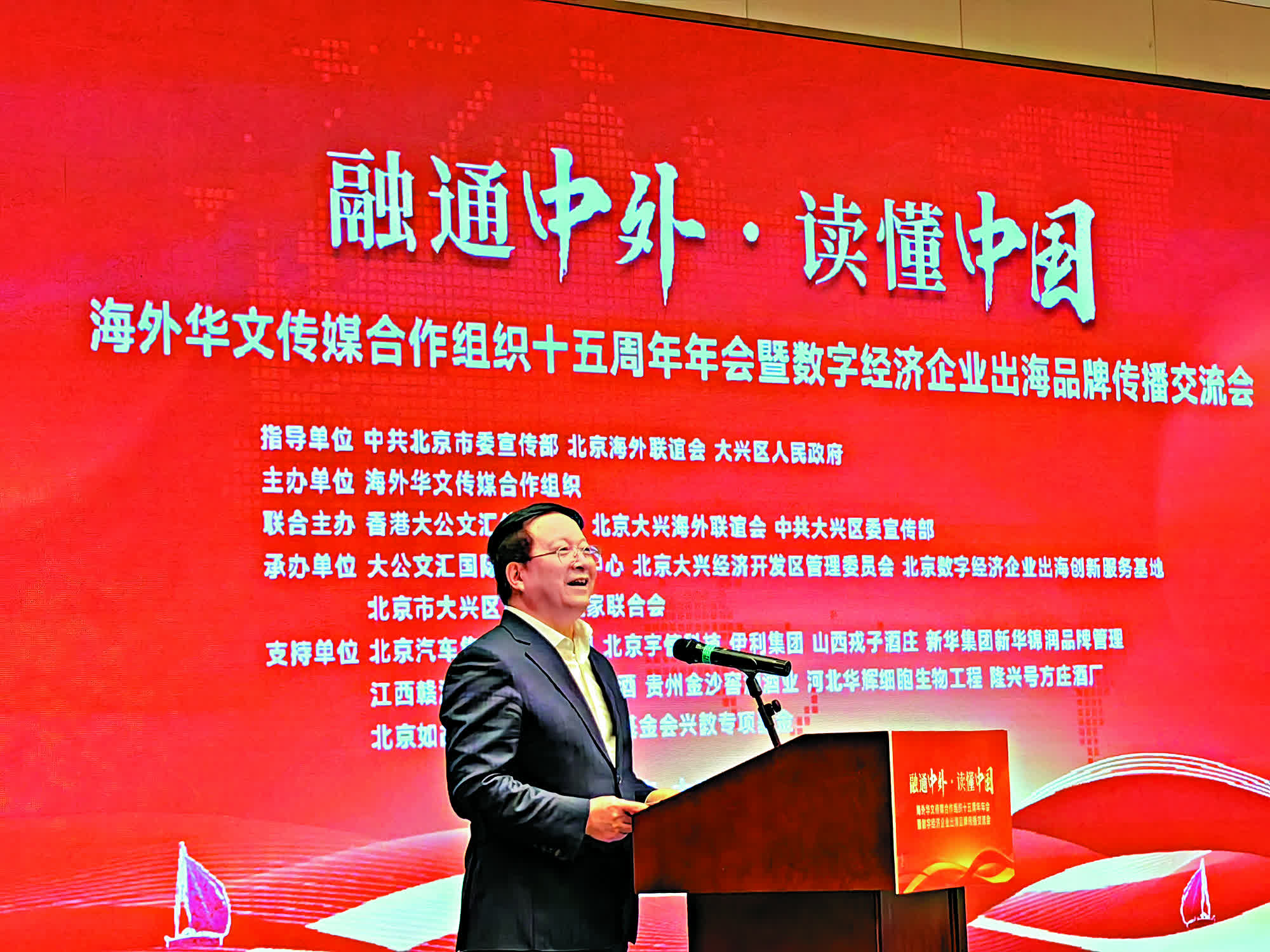 (大公報記者 羅洪嘯、蘇雨潤北京報道)海外華文傳媒合作組織(2024)十五周年年會暨數字經濟企業出海品牌傳播交流會13日在北京大興舉辦,來自全球60餘家海外華文傳媒高層齊聚北京,將共同探討加快海外華文媒體融合,共商共建中國話語和中國敘事體系,助力全球更好地理解中國、讀懂中國。此次會議主要議程包括啟動「海外華人眼中的十大新聞評選」活動等。本屆年會將舉辦多場主題活動和參訪活動,聚焦數字經濟發展。會後,海外華媒高層還將深度走訪北汽集團、京東集團近距離感受中國企業的發展。