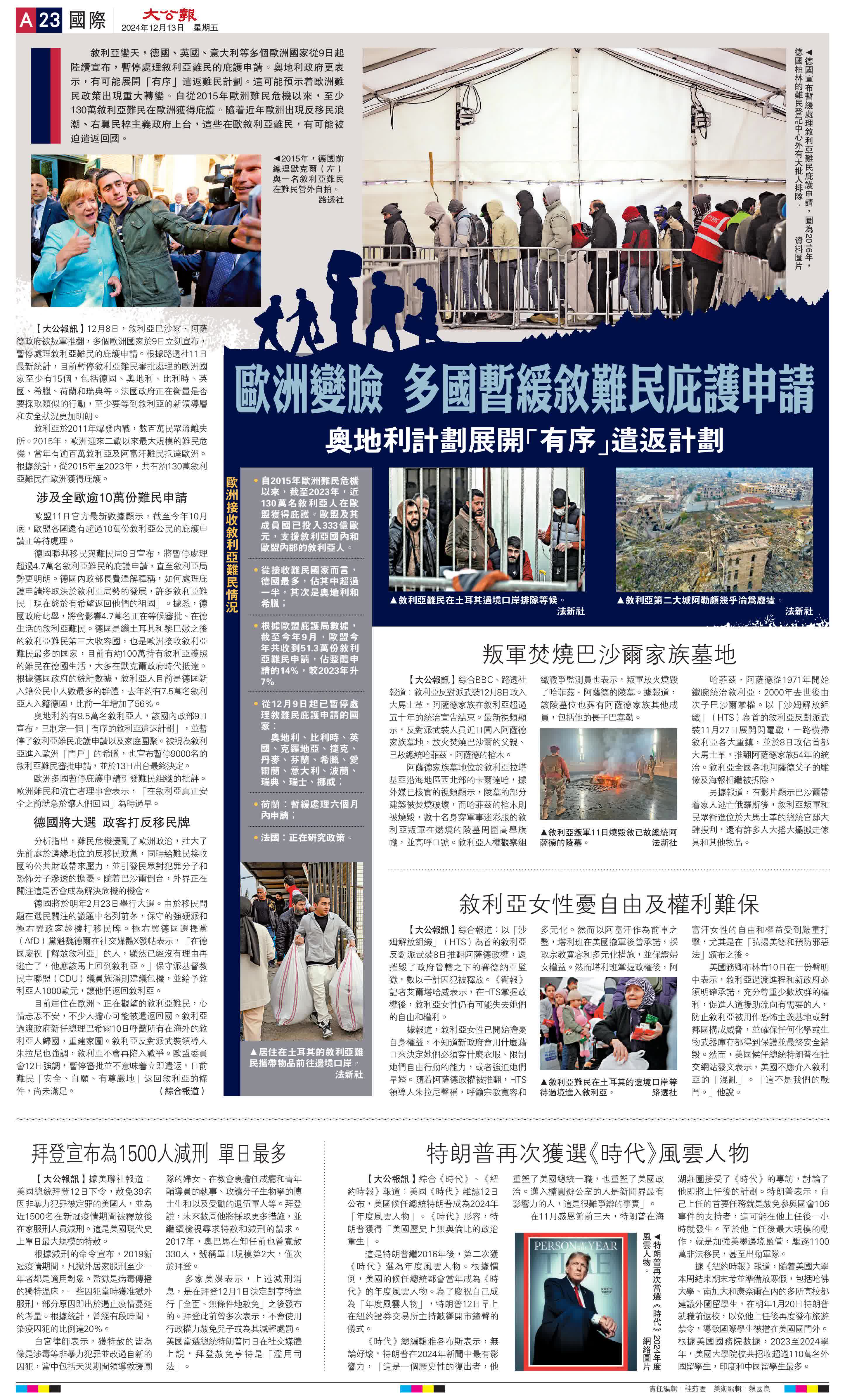 12月8日,敘利亞巴沙爾·阿薩德政府被叛軍推翻,多個歐洲國家於9日立刻宣布,暫停處理敘利亞難民的庇護申請。根據路透社11日最新統計,目前暫停敘利亞難民審批處理的歐洲國家至少有15個,包括德國、奧地利、比利時、英國、希臘、荷蘭和瑞典等。法國政府正在衡量是否要採取類似的行動,至少要等到敘利亞的新領導層和安全狀況更加明朗。