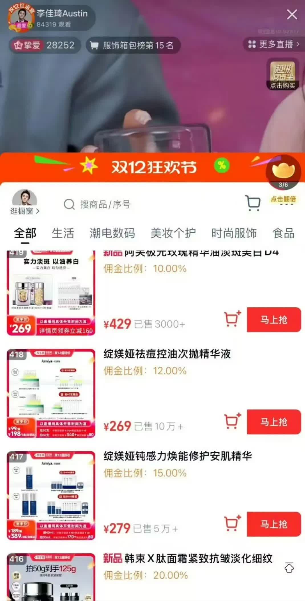 據江南都市報報道,在昨晚「雙十二」李佳琦直播間內,網友發現購物車內可以看到每件商品的佣金比例,每套化妝品的佣金比例約為10%至20%,即每件產品大約賺取30到60元(人民幣)。