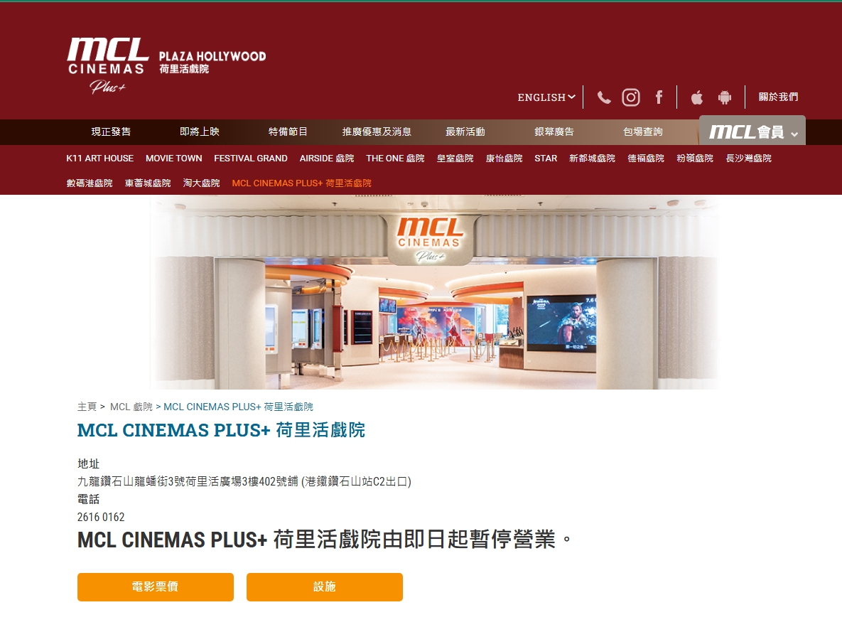 大公文匯全媒體報道,本港電影行業面對衝擊,戲院迎結業潮。2022年才開業的MCL荷里活廣場戲院前晚(11日)傳出昨日(12日)最後一日營運,今日(13日)起結業。MCL已於官網公布,荷里活戲院即日起暫停營業。