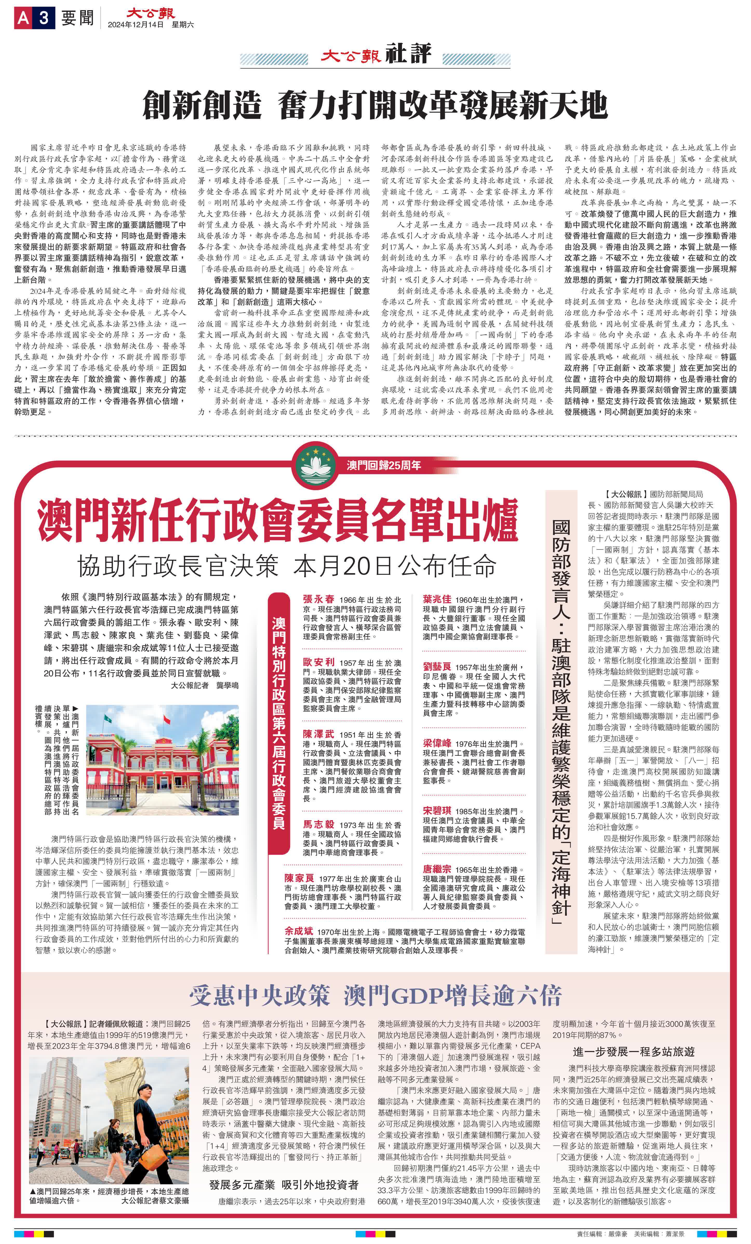 (大公報記者 龔學鳴)依照《澳門特別行政區基本法》的有關規定,澳門特區第六任行政長官岑浩輝已完成澳門特區第六屆行政會委員的籌組工作。張永春、歐安利、陳澤武、馬志毅、陳家良、葉兆佳、劉藝良、梁偉峰、宋碧琪、唐繼宗和余成斌等11位人士已接受邀請,將出任行政會成員。有關的行政命令將於本月20日公布,11名行政會委員並於同日宣誓就職。
