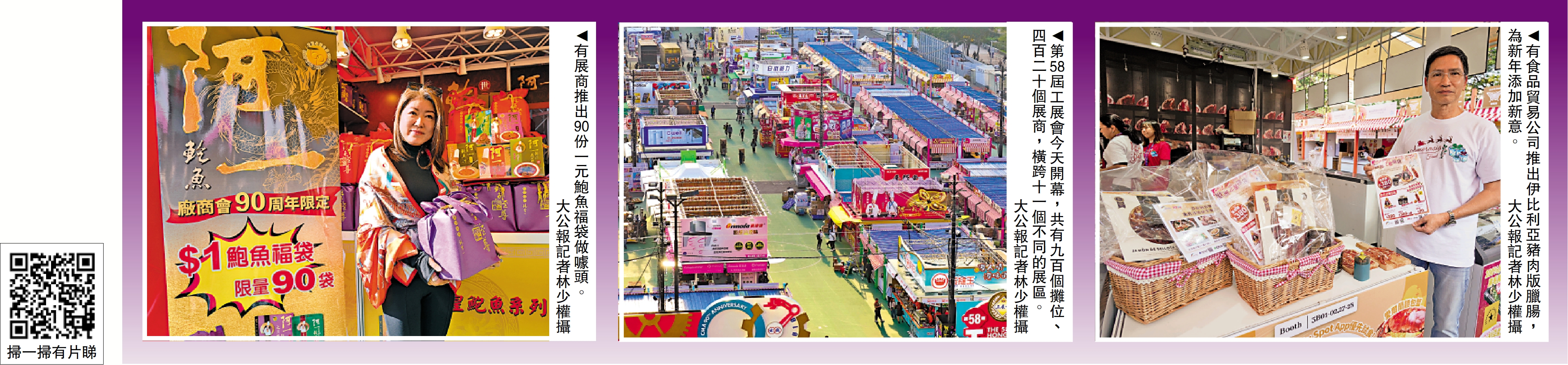 【大公報記者 劉碩源(文)張凱文、林少權(視頻】由廠商會主辦的第58屆工展會,今日起至明年1月6日在維園舉行。臨近年尾及農曆新年,加上深圳居民「一簽多行」措施恢復實施,參展商對銷情表示樂觀。有售賣鮑魚的參展商預料,工展會臨近新年,能夠吸引市民留港消費,亦預計會有「一簽多行」遊客前來置辦年貨,估計銷售額較去年多兩成。