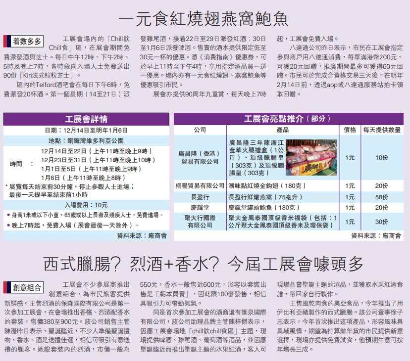 工展會由今天起一連24日舉行,420個商家參與,設900個攤位。作為「一簽多行」恢復實施後的首個工展會,日期臨近農曆新年,又橫跨聖誕、元旦等節日,參展商對銷售普遍感樂觀,預料可吸引大批市民和旅客入場購物,紛紛推出一元鮑魚、十元紅酒,以及推出近3折的優惠產品吸客。