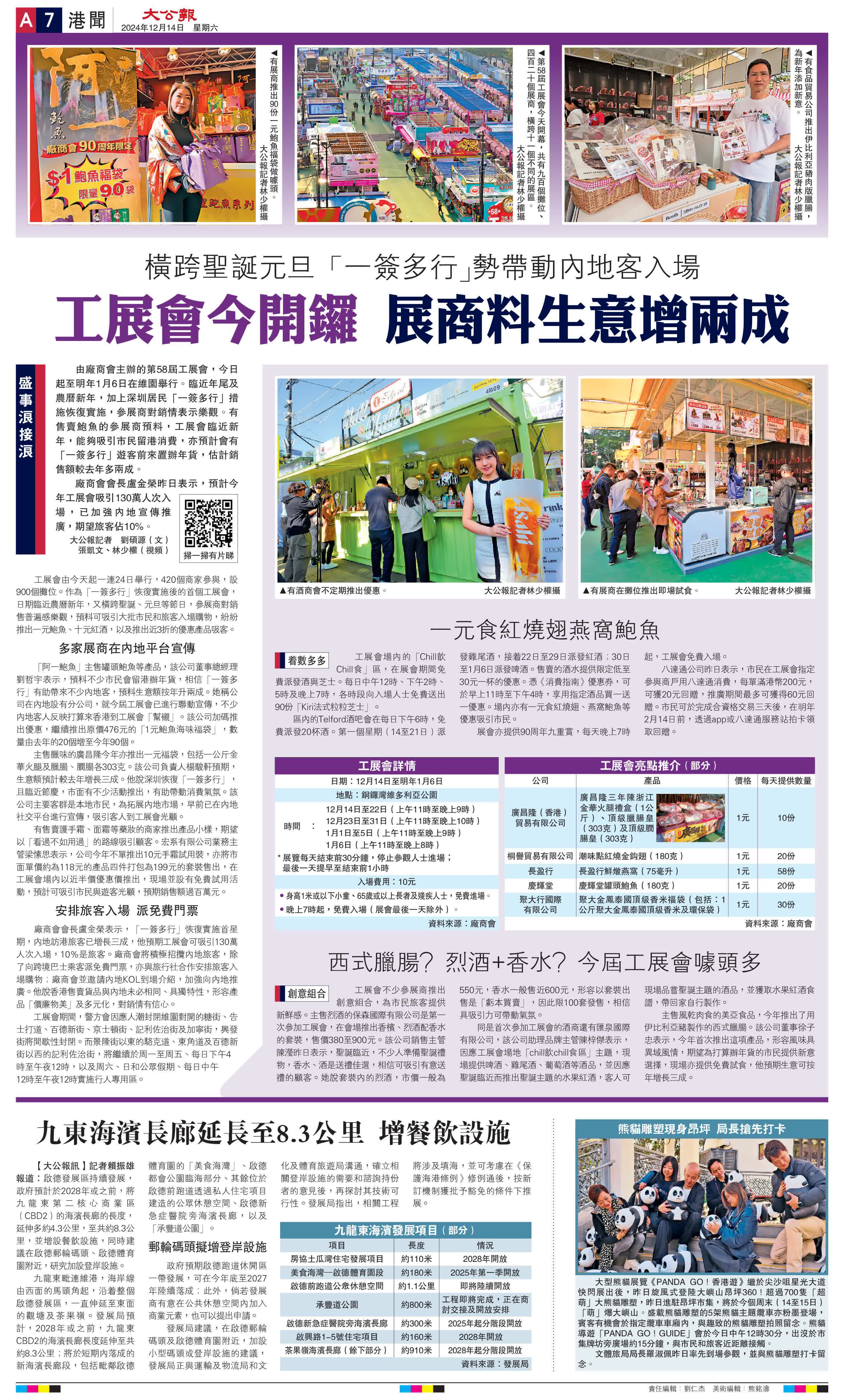 主售臘味的廣昌隆今年亦推出一元福袋,包括一公斤金華火腿及臘腸、膶腸各303克。該公司負責人楊駿軒預期,生意額預計較去年增長三成。他說深圳恢復「一簽多行」,且臨近節慶,市面有不少活動推出,有助帶動消費氣氛。該公司主要客群是本地市民,為拓展內地市場,早前已在內地社交平台進行宣傳,吸引客人到工展會光顧。