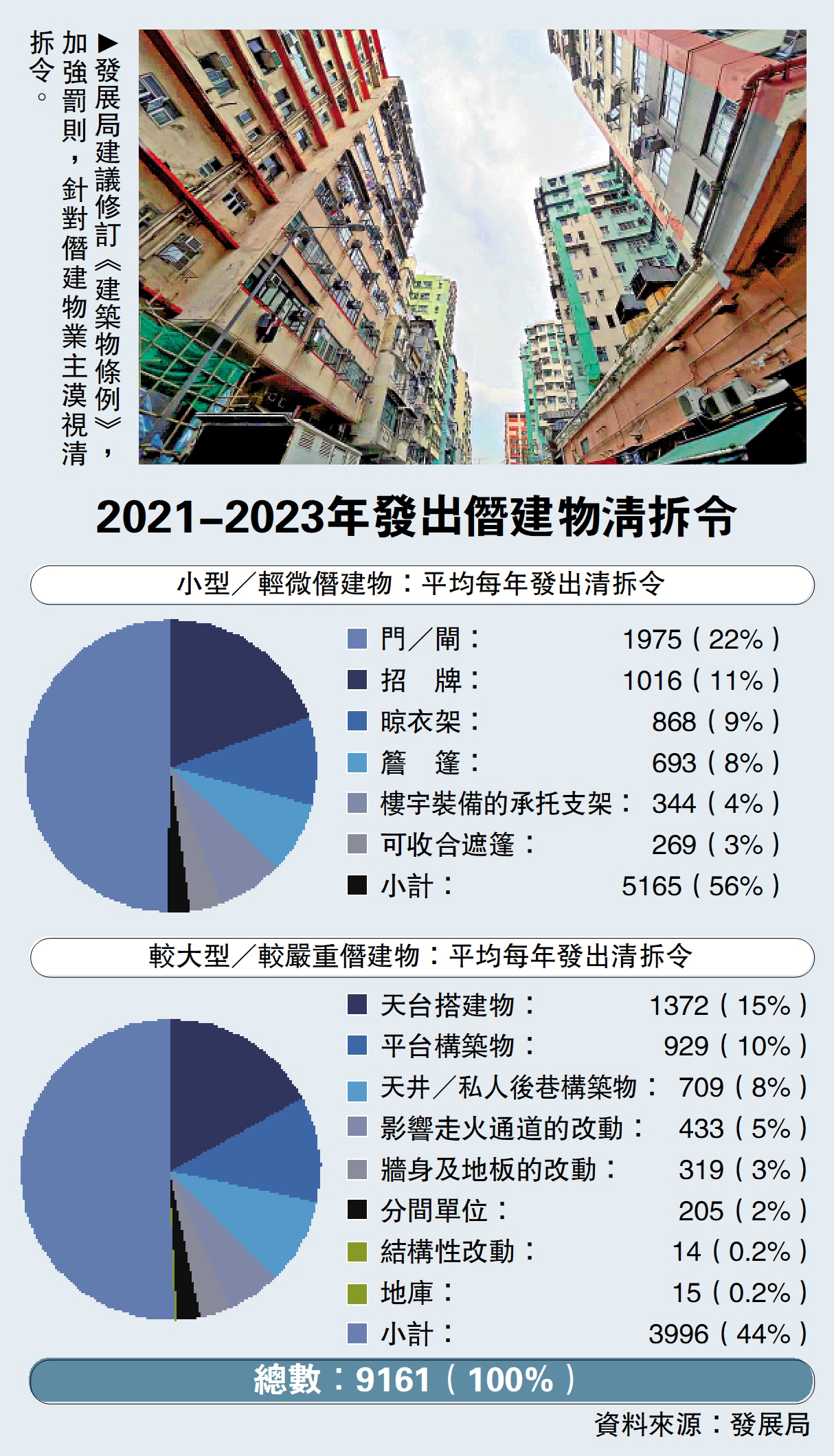 發展局並建議,針對僭建地庫、圍封天台等「嚴重僭建物」,不遵辦清拆令的罰款提升為30萬元,監禁兩年(詳見表)。發展局發言人稱,過往檢控僭建,需證明業主或承建商等明知故犯,但日後只要有合理懷疑僭建與業主等有關,就可以檢控,罰則提高至罰款200萬元及監禁2年,並會要求法庭量刑時,考慮僭建物大小、物業位置等,例如豪宅獨立屋帶來的經濟效益,和舊樓天台僭建有差別,量刑時應反映。