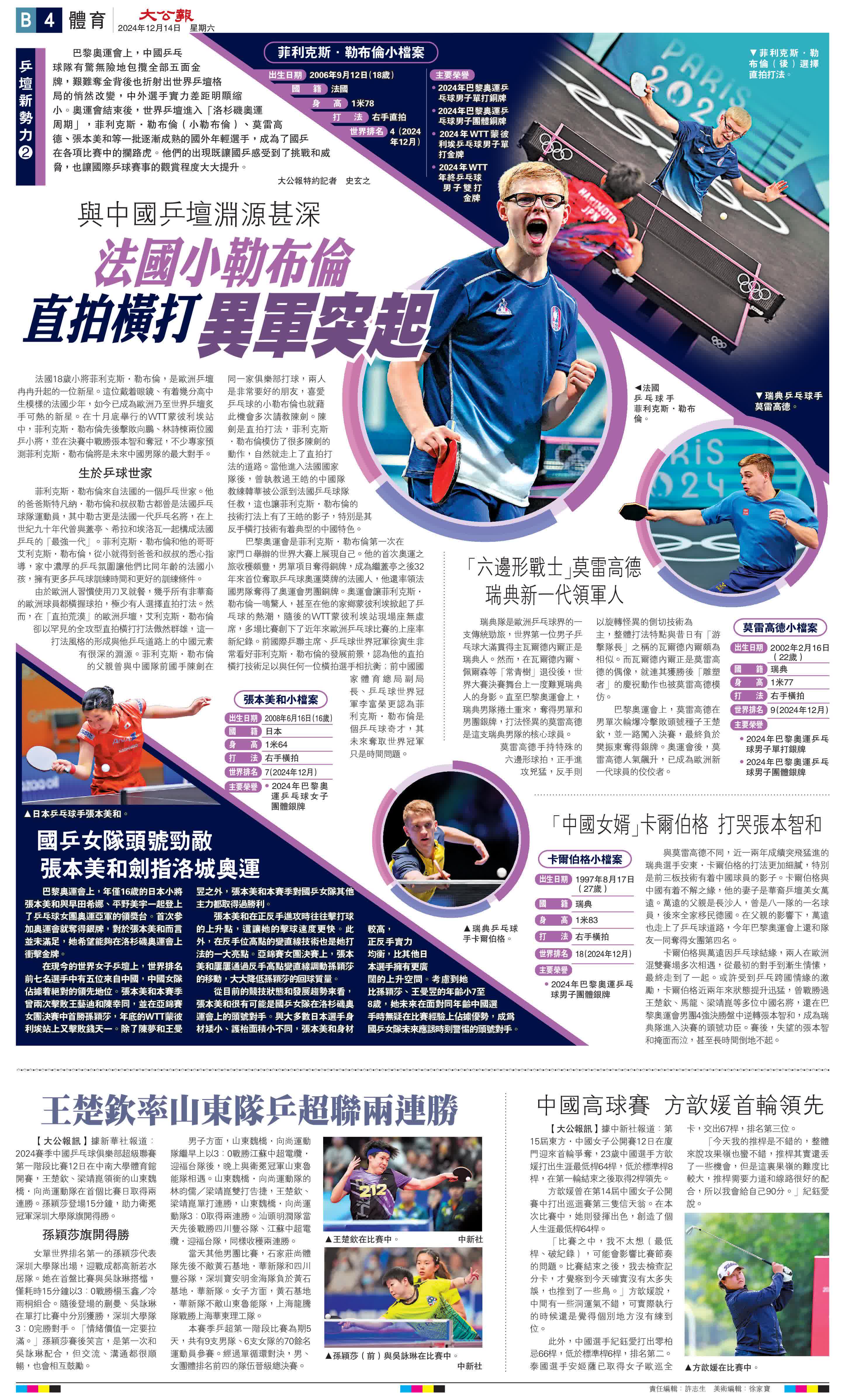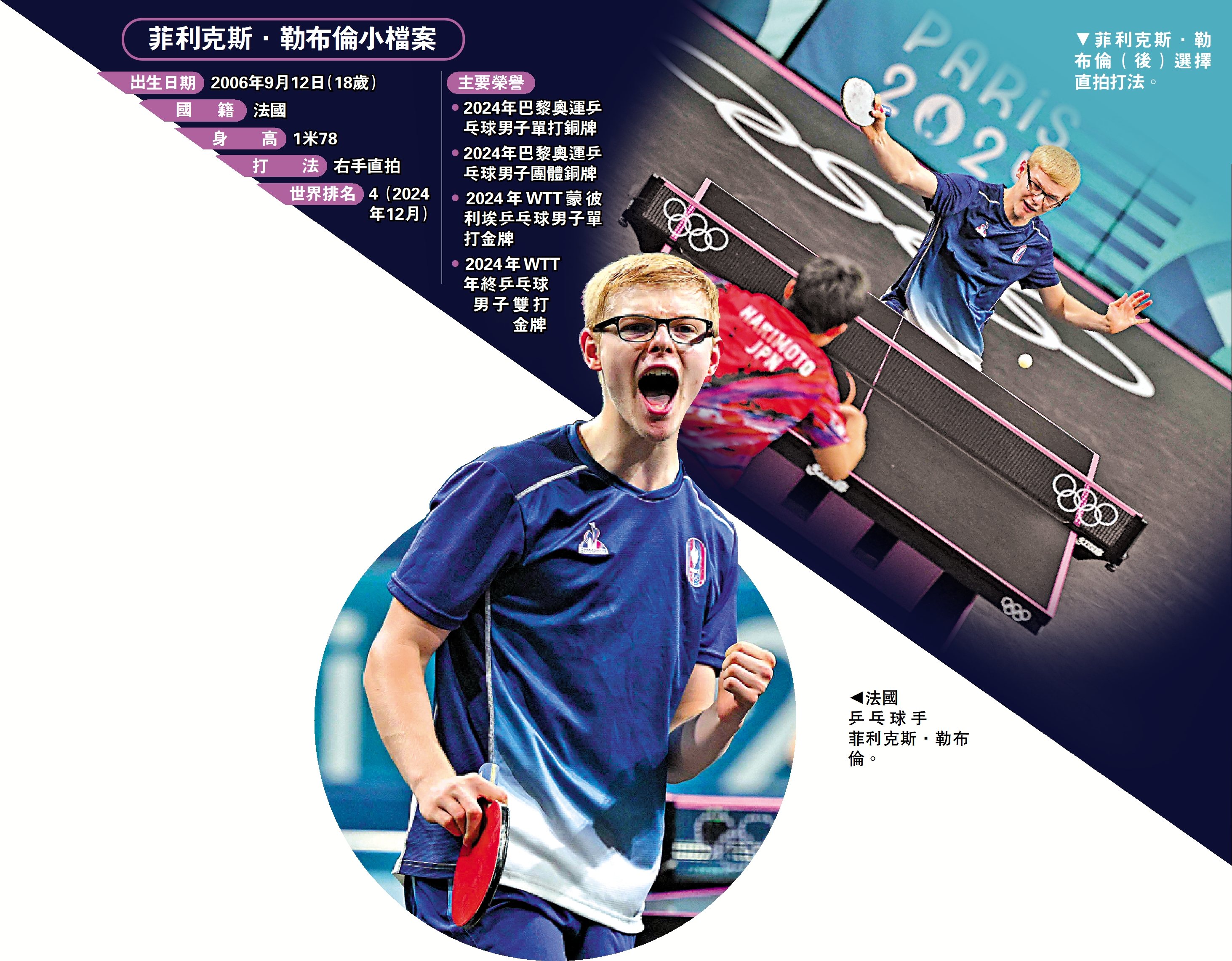 (大公報特約記者 史玄之)巴黎奧運會上,中國乒乓球隊有驚無險地包攬全部五面金牌,艱難奪金背後也折射出世界乒壇格局的悄然改變,中外選手實力差距明顯縮小。奧運會結束後,世界乒壇進入「洛杉磯奧運周期」,菲利克斯·勒布倫(小勒布倫)、莫雷高德、張本美和等一批逐漸成熟的國外年輕選手,成為了國乒在各項比賽中的攔路虎。他們的出現既讓國乒感受到了挑戰和威脅,也讓國際乒球賽事的觀賞程度大大提升。