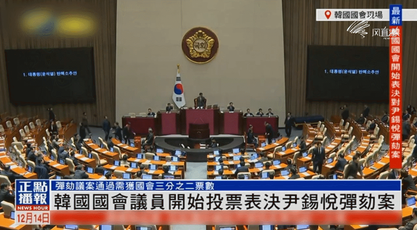 據央視新聞報道,韓國國會當地時間14日16時舉行全體會議,就在野黨陣營第二次提出的尹錫悅總統彈劾案進行表決。根據投票結果,彈劾案最終獲得通過,尹錫悅的總統職務立即停止。