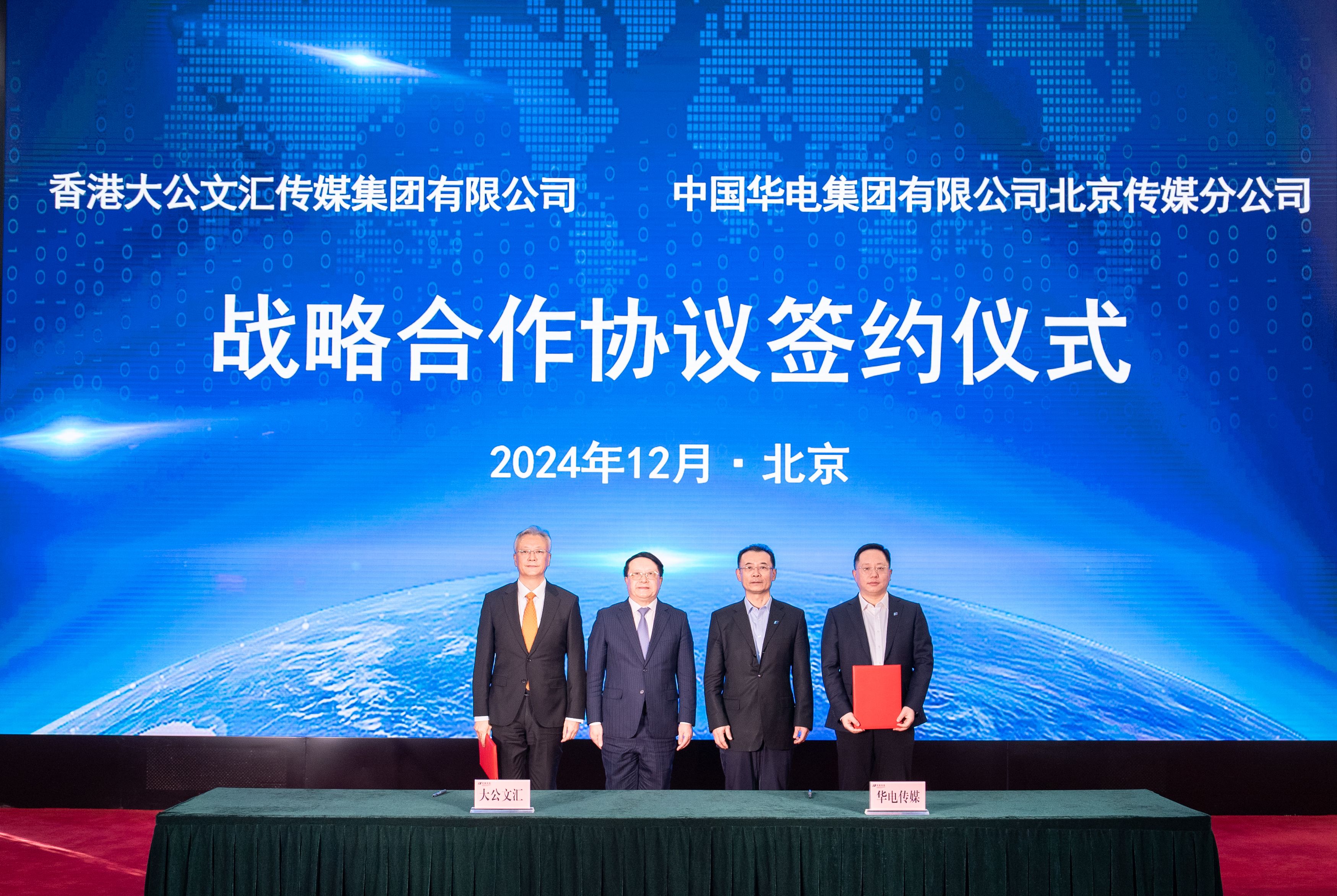 中國華電集團品牌與宣傳中心(華電傳媒)主任伊建偉、香港大公文匯傳媒集團副總經理婁冰代表雙方簽約。中國華電集團黨建部主任賴文勝、中國華電集團品牌與宣傳中心(華電傳媒)副主任王瑋,香港大公文匯傳媒集團社長助理、大公文匯國際文化傳播有限公司執行總裁王逍參加活動。