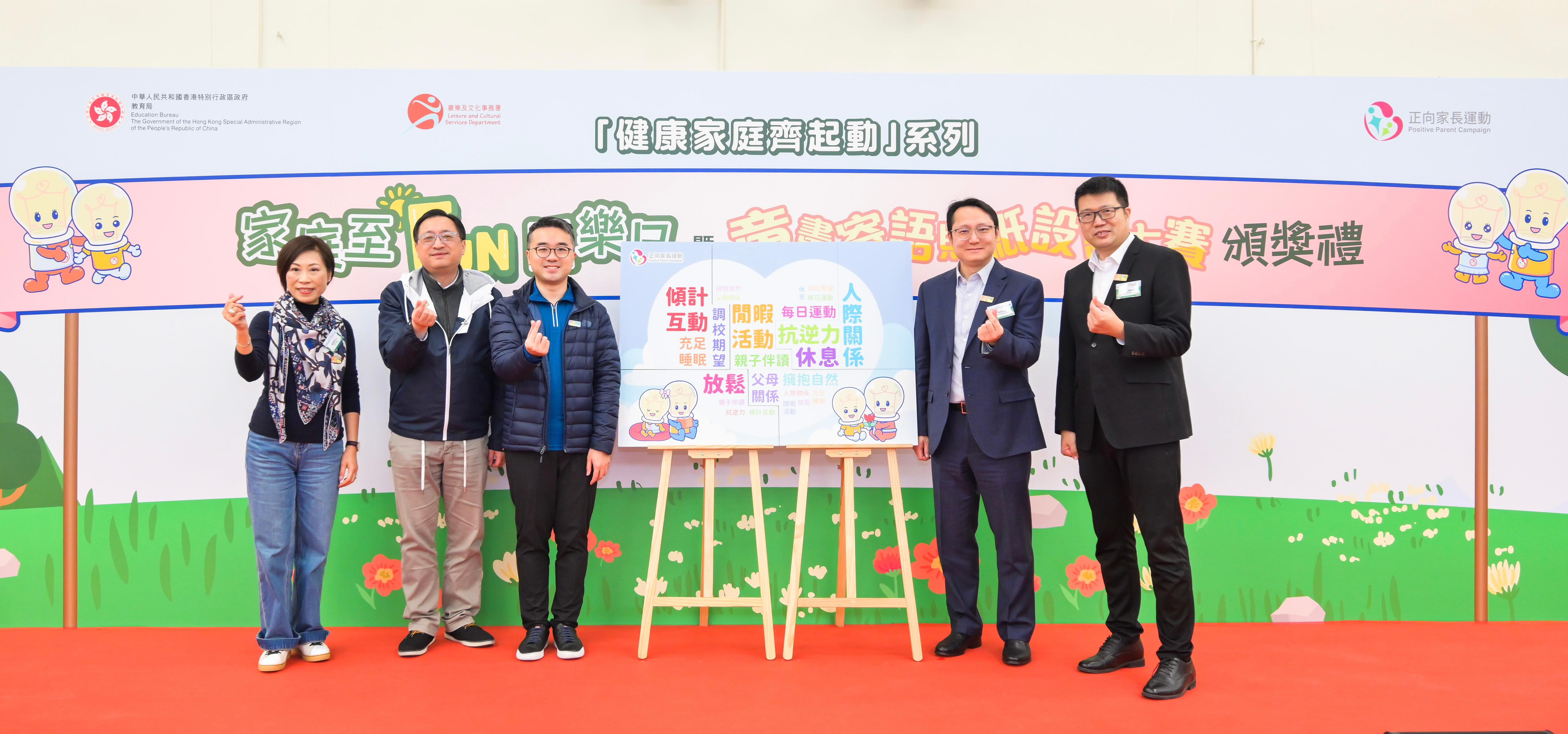 教育局在同樂日的頒獎禮上頒發獎項予親子尋寶定向比賽及「健康家庭齊起動系列——童畫寄語貼紙設計大賽」的得獎學校、學生和家長,表揚他們積極參與「正向家長運動」活動,共同推廣健康生活。