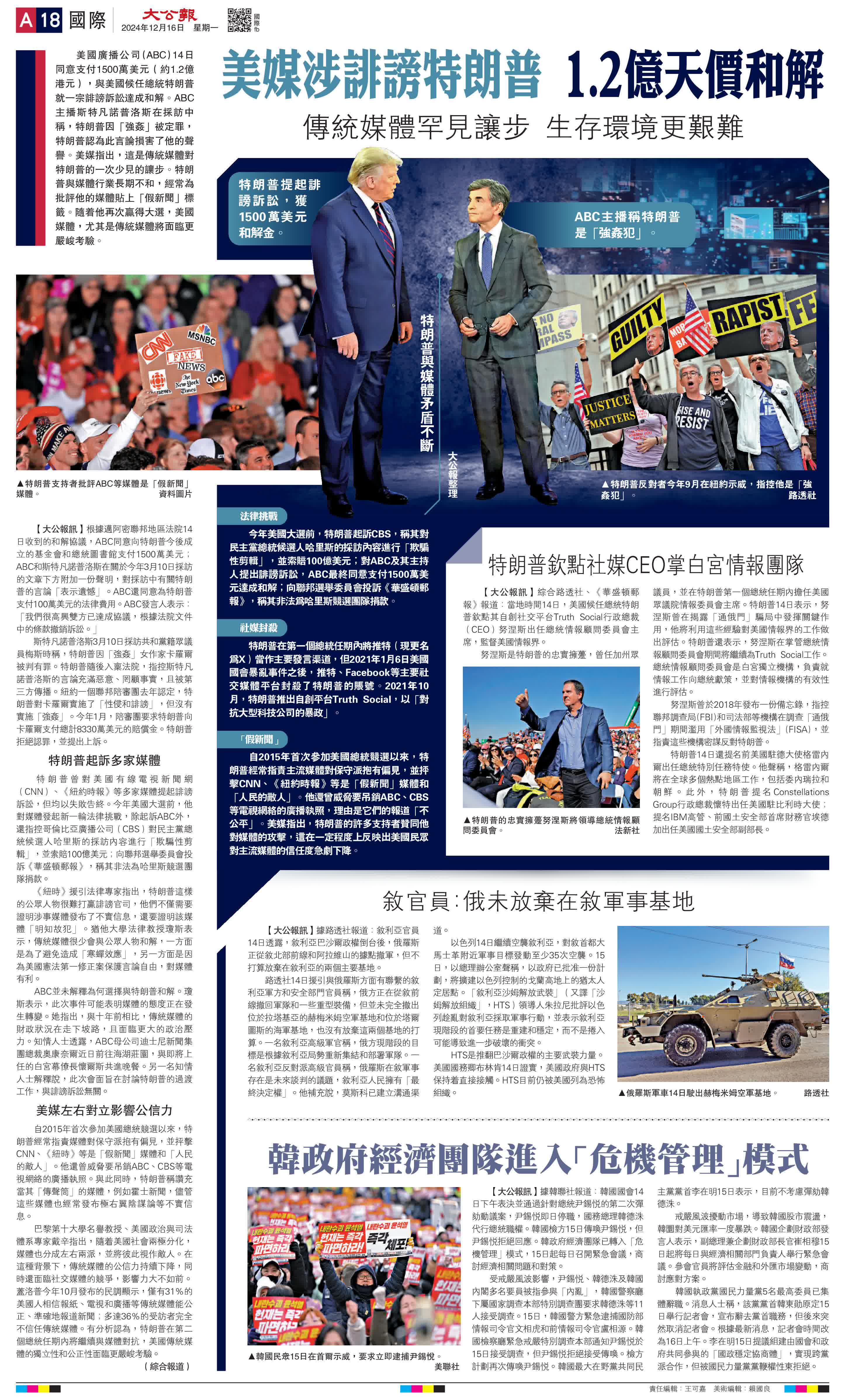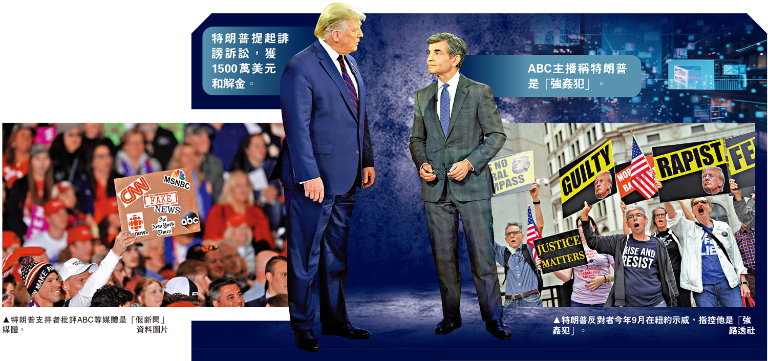 大公報綜合報道,美國廣播公司(ABC)14日同意支付1500萬美元(約1.2億港元),與美國候任總統特朗普就一宗誹謗訴訟達成和解。ABC主播斯特凡諾普洛斯在採訪中稱,特朗普因「強姦」被定罪,特朗普認為此言論損害了他的聲譽。美媒指出,這是傳統媒體對特朗普的一次少見的讓步。特朗普與媒體行業長期不和,經常為批評他的媒體貼上「假新聞」標籤。隨着他再次贏得大選,美國媒體,尤其是傳統媒體將面臨更嚴峻考驗。