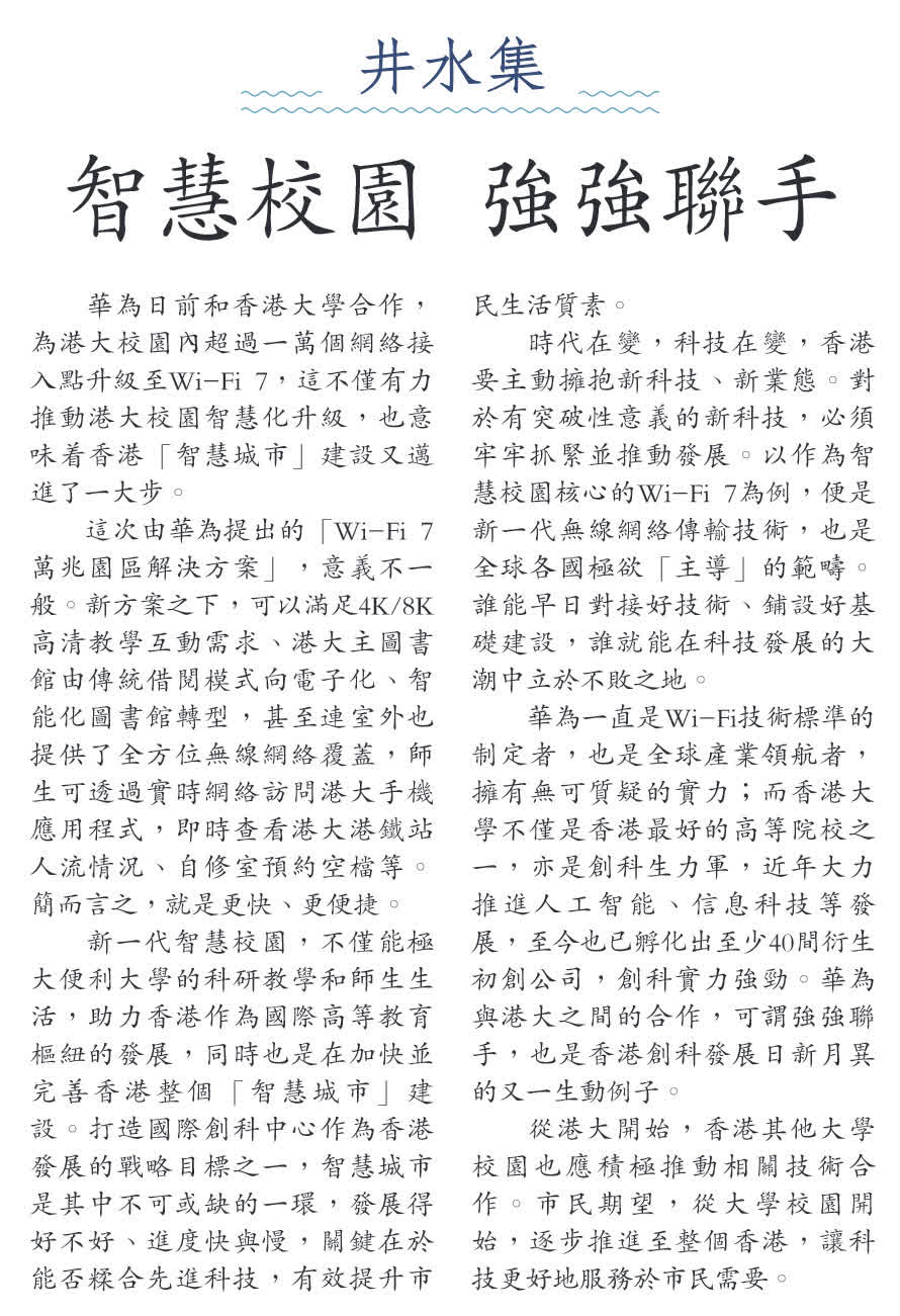 華為日前和香港大學合作,為港大校園內超過一萬個網絡接入點升級至Wi-Fi 7,這不僅有力推動港大校園智慧化升級,也意味着香港「智慧城市」建設又邁進了一大步。
