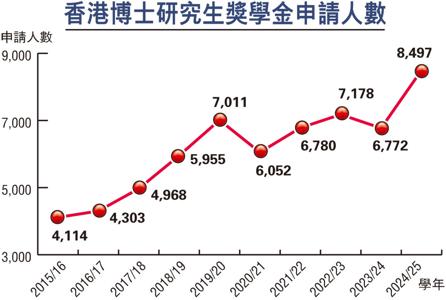 (香港文匯報記者 陸雅楠)香港活用本地大學教育和科研優勢,致力招攬及培養來自世界各地的高學歷頂尖博士學生,以壯大國際高端人才庫,推動社會高質量發展。香港研究資助局的博士研究生獎學金計劃(HKPFS),透過總計逾百萬元的獎學金金額,致力吸納全球研究人才;今年計劃名額增加50個至350個,相關申請亦更見火熱。根據研資局日前向香港文匯報獨家提供的數字,2024/25學年HKPFS共收到全球近8,500人申請,按年大增25.5%,當中有超過2,000名申請者來自香港和內地以外的地區,突顯了香港集聚國際高端人才的吸引力。香港教育界人士表示,隨着特區政府進一步推廣「留學香港」品牌,估計未來國際博士生申請人數維持上升趨勢。