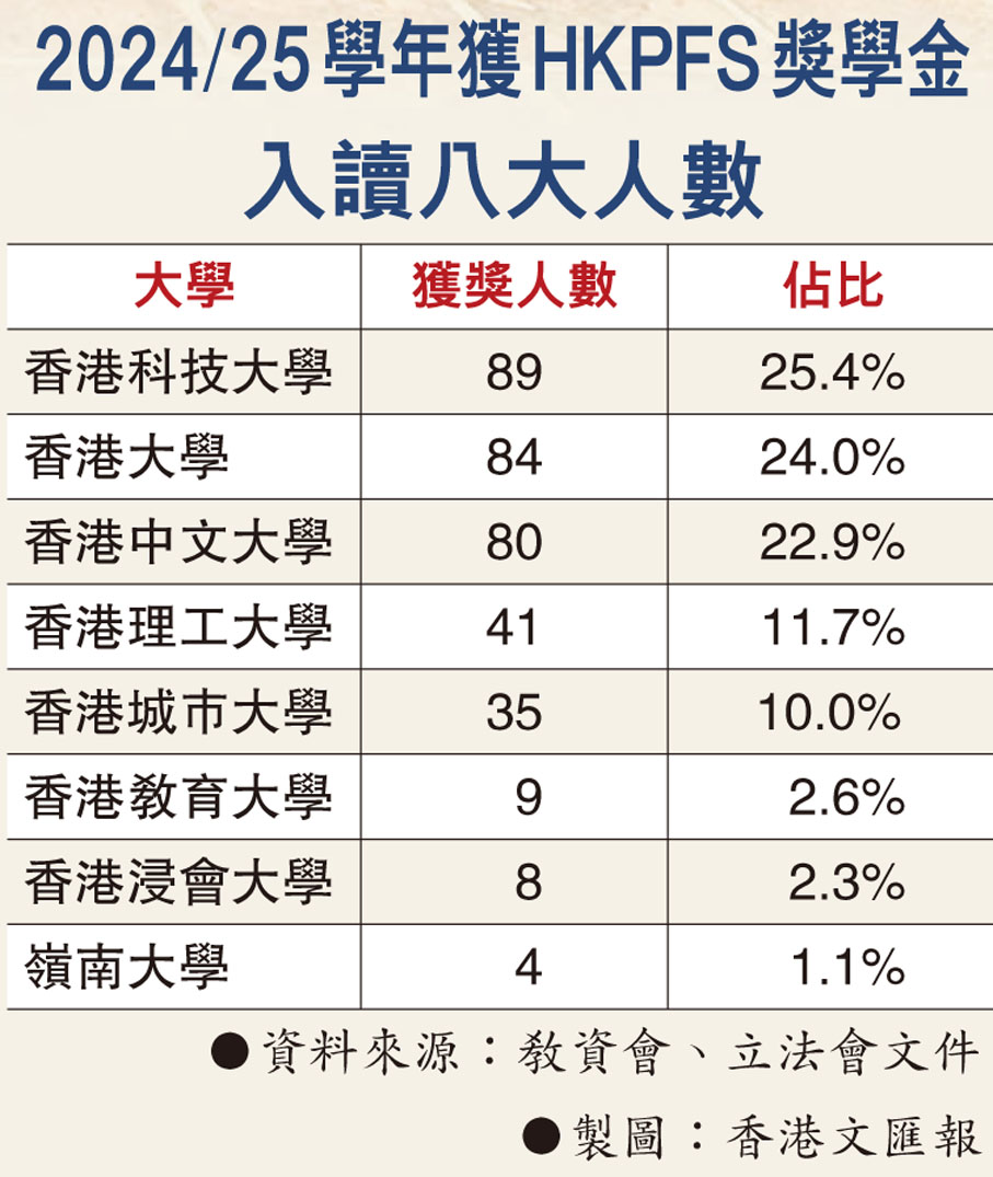 針對頂尖博士生的培育,特區政府近年持續增加對HKPFS的投資,每年名額由原有的300個增至本學年的350個,2025/26學年更會進一步增至400個;而每年獎學金金額,亦將增至33.72萬港元,另加1.4萬元會議及研究活動交通津貼,為期3年,比一般博士生津貼(約每月1.9萬港元)豐厚約50%。