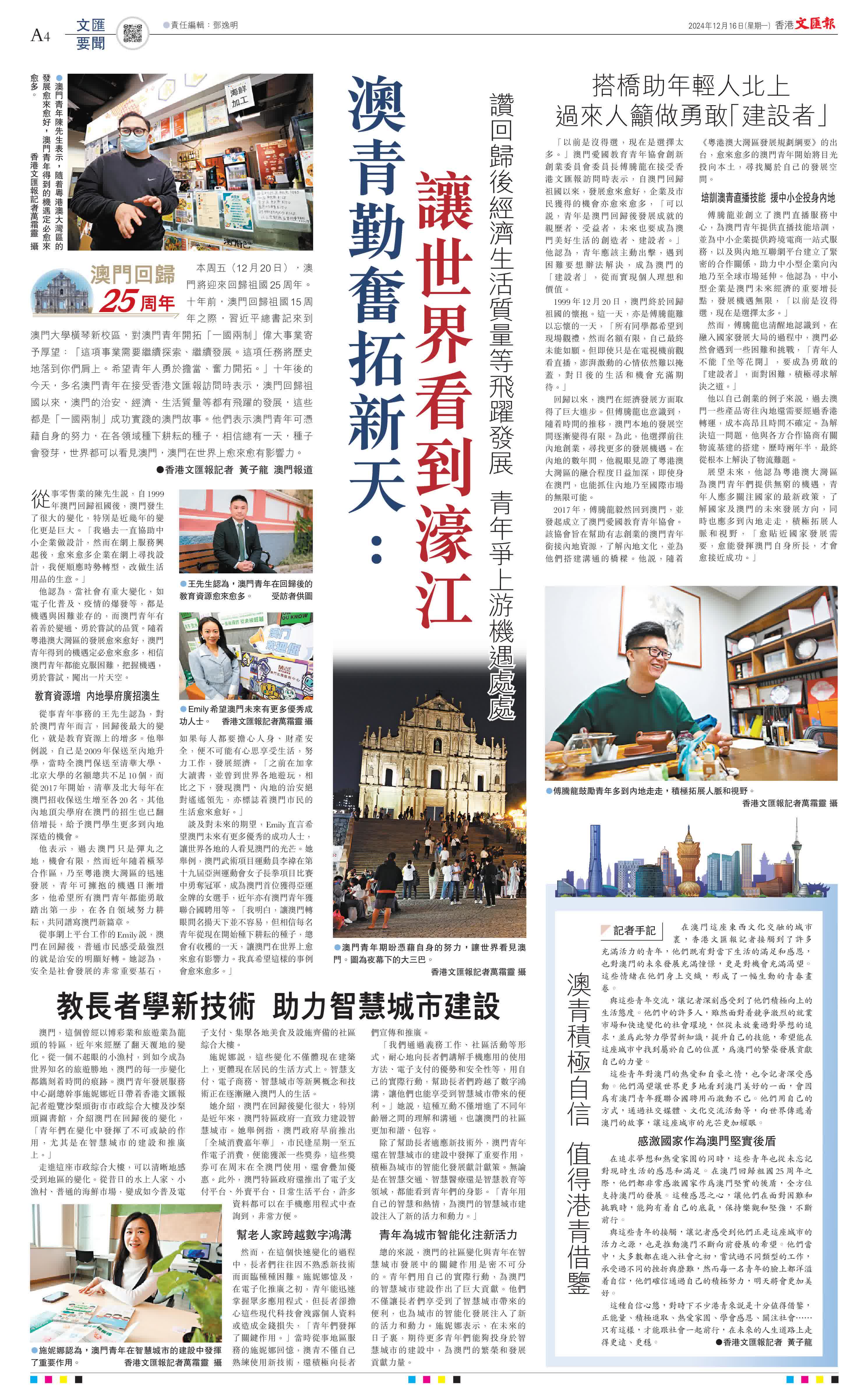 在澳門這座東西文化交融的城市裏,香港文匯報記者接觸到了許多充滿活力的青年,他們既有對當下生活的滿足和感恩,也對澳門的未來發展充滿憧憬,更是對機會充滿渴望。這些情緒在他們身上交織,形成了一幅生動的青春畫卷。