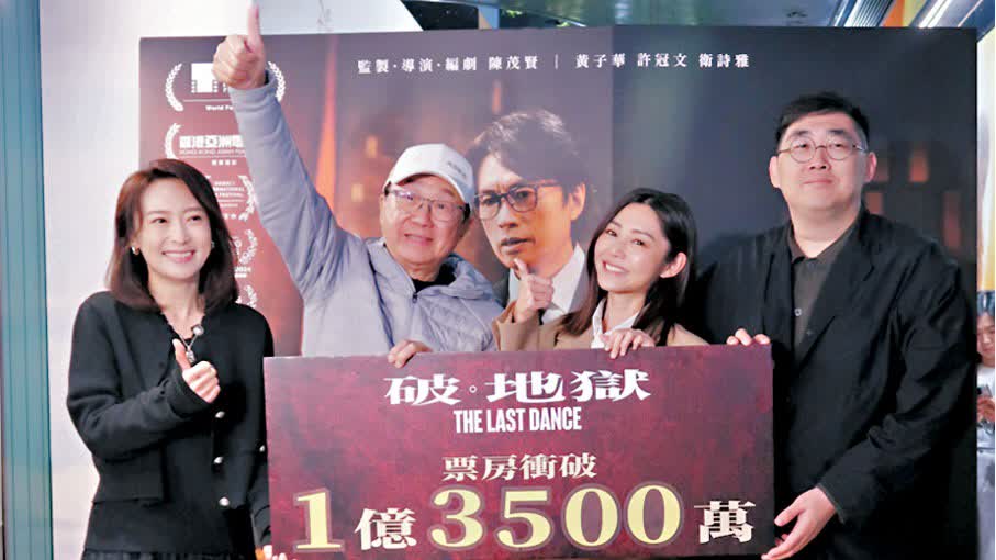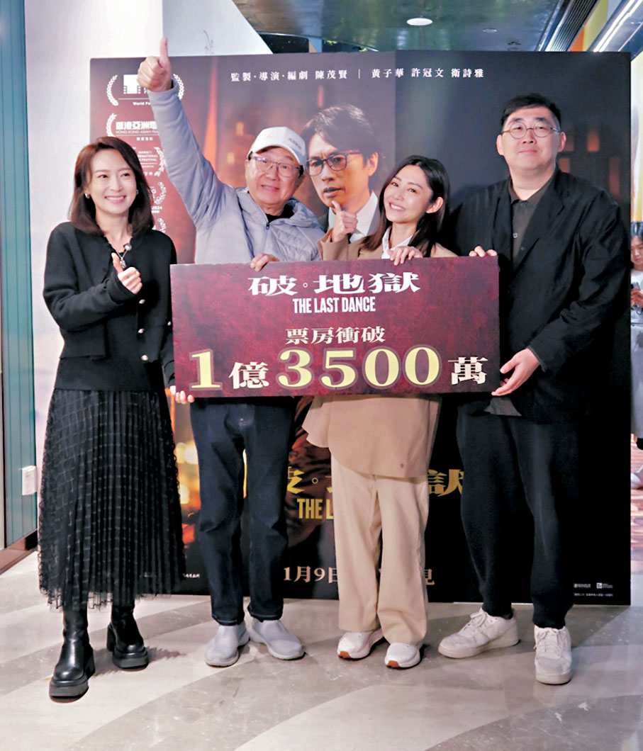 (香港文匯報記者 蘇榕蓉 福州報道)由黃子華、許冠文(米高)、衛詩雅及周家怡演出的電影《破·地獄》連日來捷報頻傳,不僅登頂香港影史華語片票房榜冠軍,票房超越1.35億元港幣。在內地與台灣,該電影也一路高歌猛進,先後登頂當地電影市場的票房冠軍,大有使港產片重回巔峰的勁頭。內地與台灣業內人士對影片也不吝溢美之詞,紛紛強力推薦。許冠文、衛詩雅及周家怡聯同導演陳茂賢昨日一起到尖沙咀戲院謝票, 並預告將舉行千人慶功宴, 其間更有影迷送上花了兩日時間畫的素描畫給許冠文。