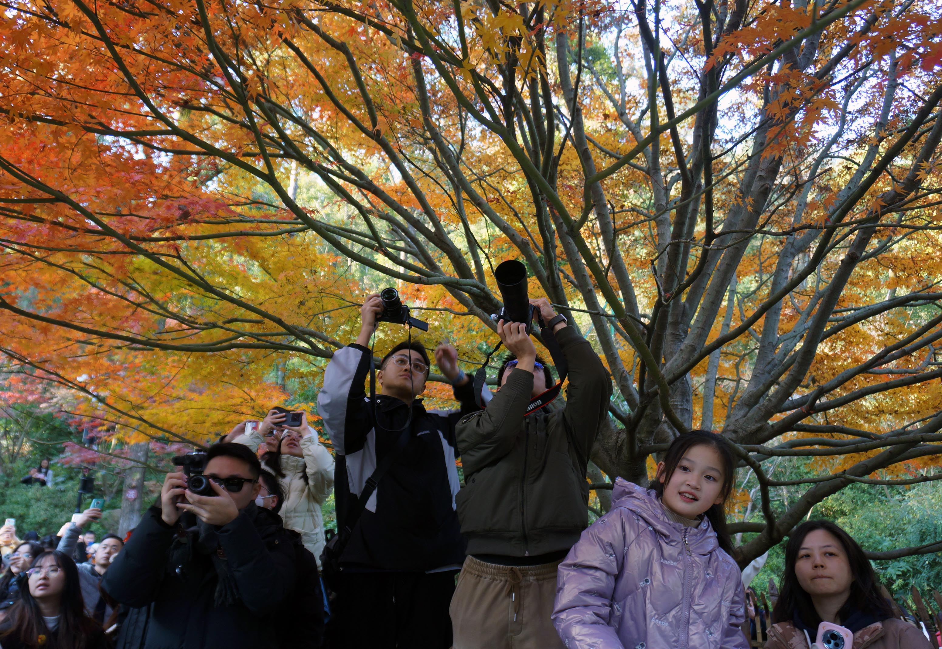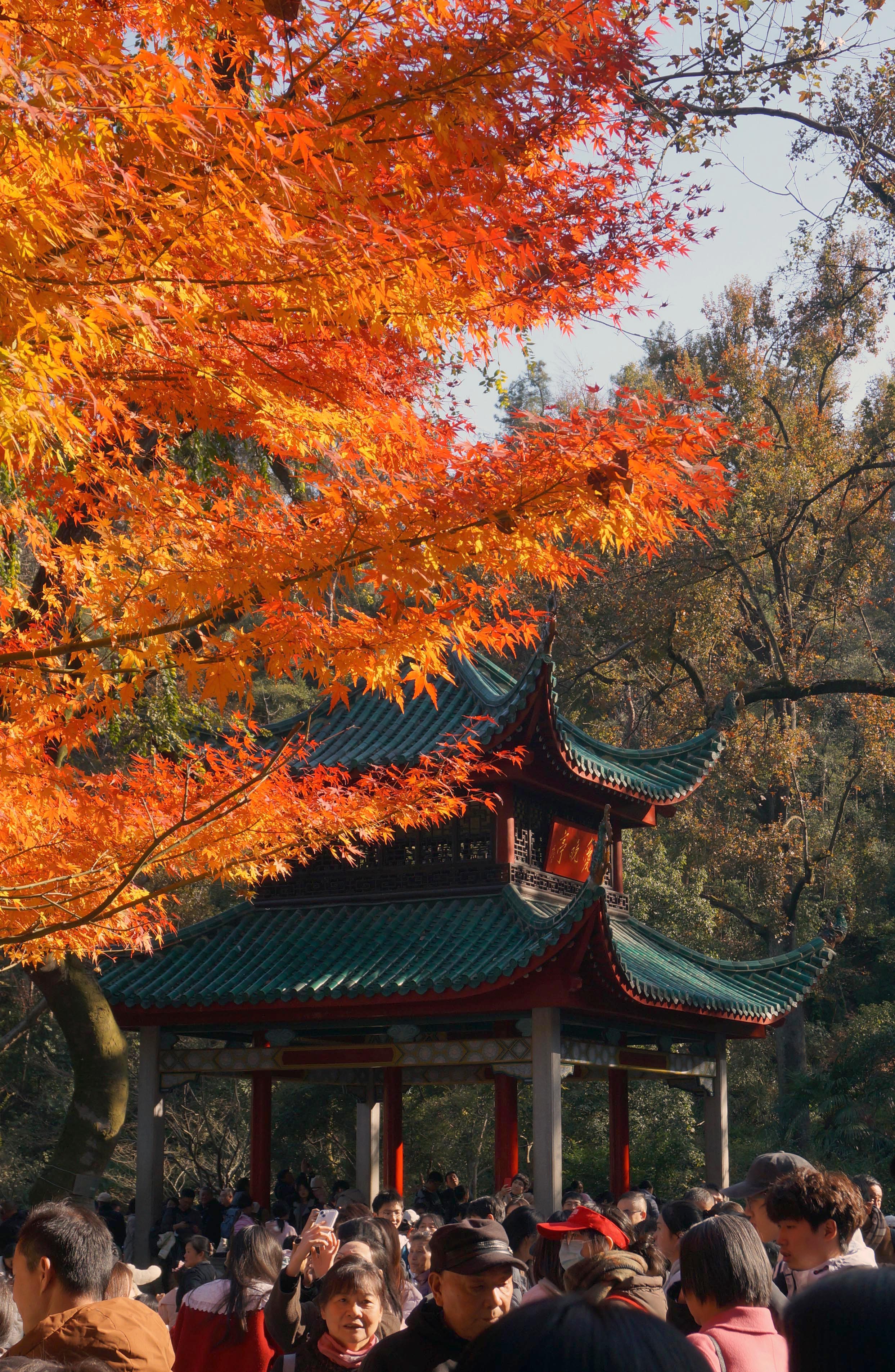 (大公文匯網記者 姚進 長沙報道)近日湖南長沙天氣晴好,陽光和煦。岳麓山被楓香、雞爪槭、北美楓香、日本紅楓等品種的彩葉植物染上了濃烈的色彩,呈現「萬山紅遍」的美景。12月15日,正值周末,記者來到岳麓山風景區,只見愛晚亭邊楓葉或橙黃如金、或紅艷勝火,色彩絢爛。大量遊客和市民湧入景區,他們呼朋引伴,拍照打卡,歡聲笑語中,現場一片歡樂祥和的氛圍。