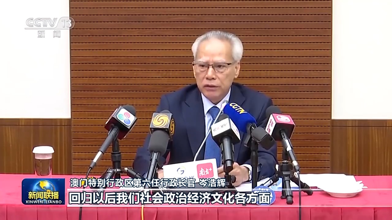 澳門特別行政區第六任行政長官 岑浩輝:回歸以後,我們社會政治經濟文化各方面有了長足的發展,尤其我們廣大澳門居民,實實在在地感受到回歸以後給他們帶來的各種權利、各種福利,那種感受是很強烈的。實踐證明「一國兩制」這種安排是有利於我們國家推進國家的統一和安全,也是有利於我們國家推進現代化發展這麼一個政策。
