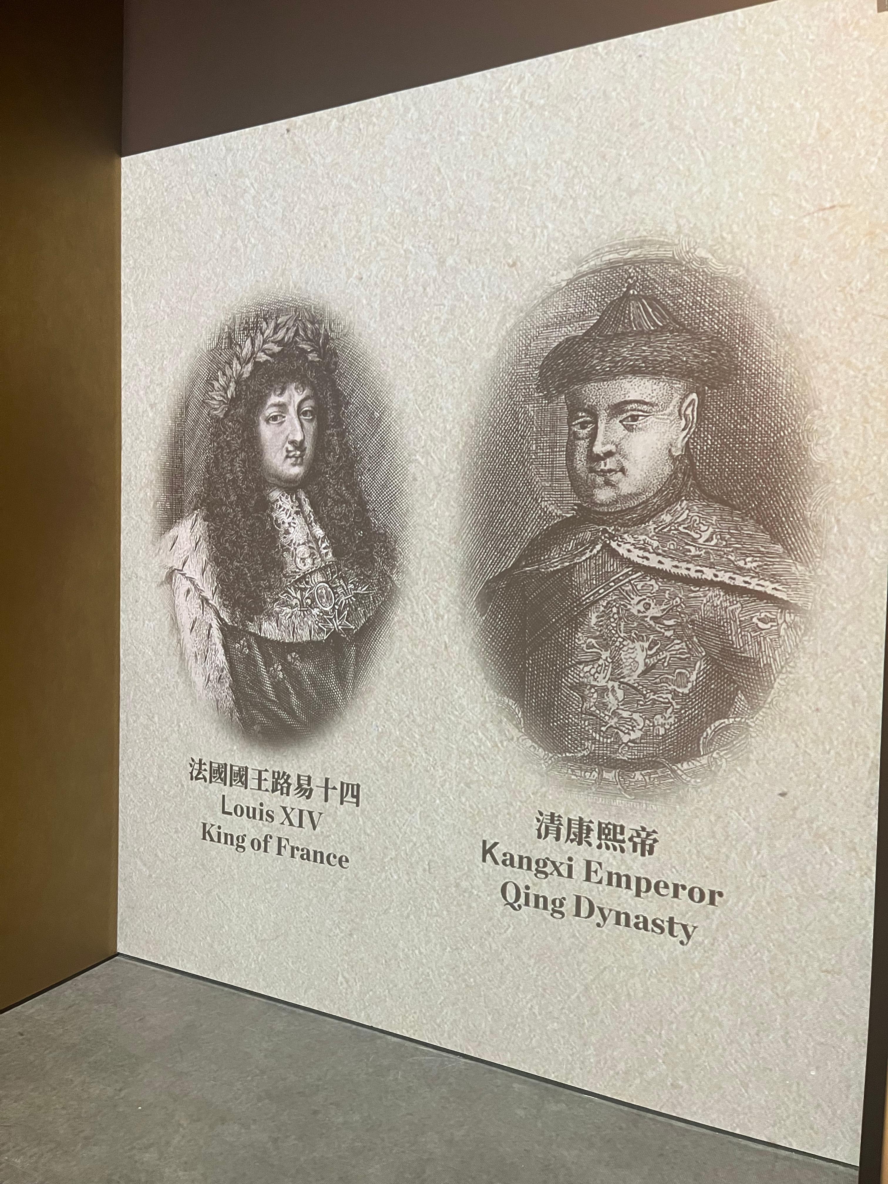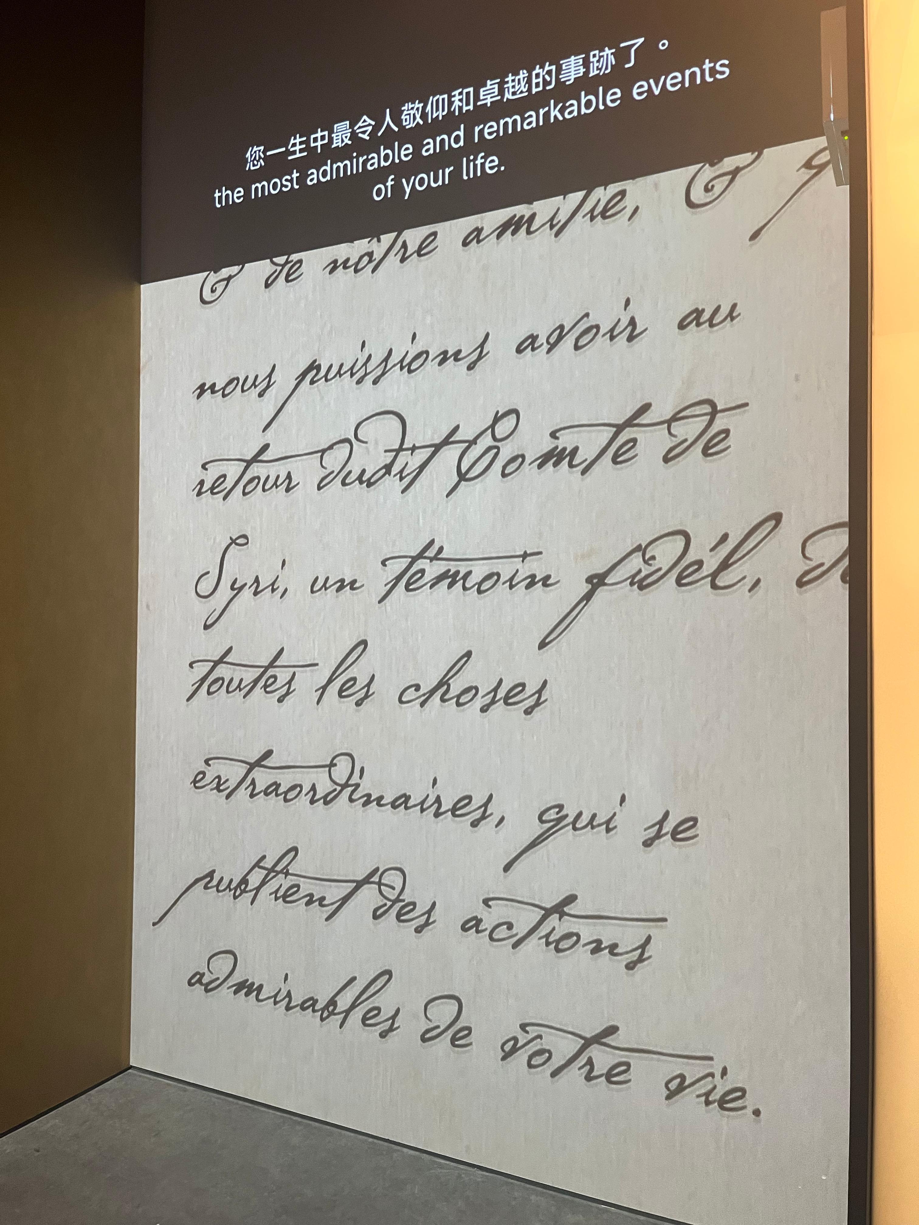 此外,參觀者還有機會沉浸式閱讀1688年路易十四寫給康熙帝的信件。信件以古法語撰寫,通過影片投影至牆面和地面,並輔以法語朗讀。路易十四在信中讚揚康熙帝,希望派遣耶穌會士來華,帶來更多的科學新知。信中更特地以「我們親愛的好友」稱呼對方。