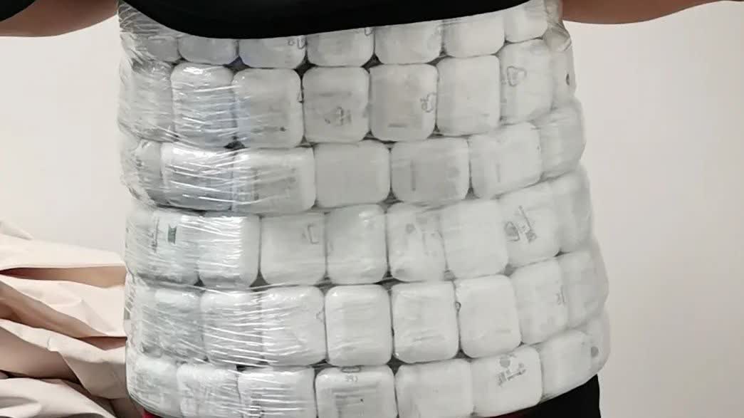 12月11日10時許,一名身穿黑色短袖、粉色外套的旅客從青茂口岸旅檢現場「無申報通道」進境,現場關員發現該旅客神色緊張,刻意用背包遮擋腹部,遂將其攔截查驗。經進一步檢查,關員在該旅客腰腹部發現用塑料膜捆綁的耳機,共計100個。