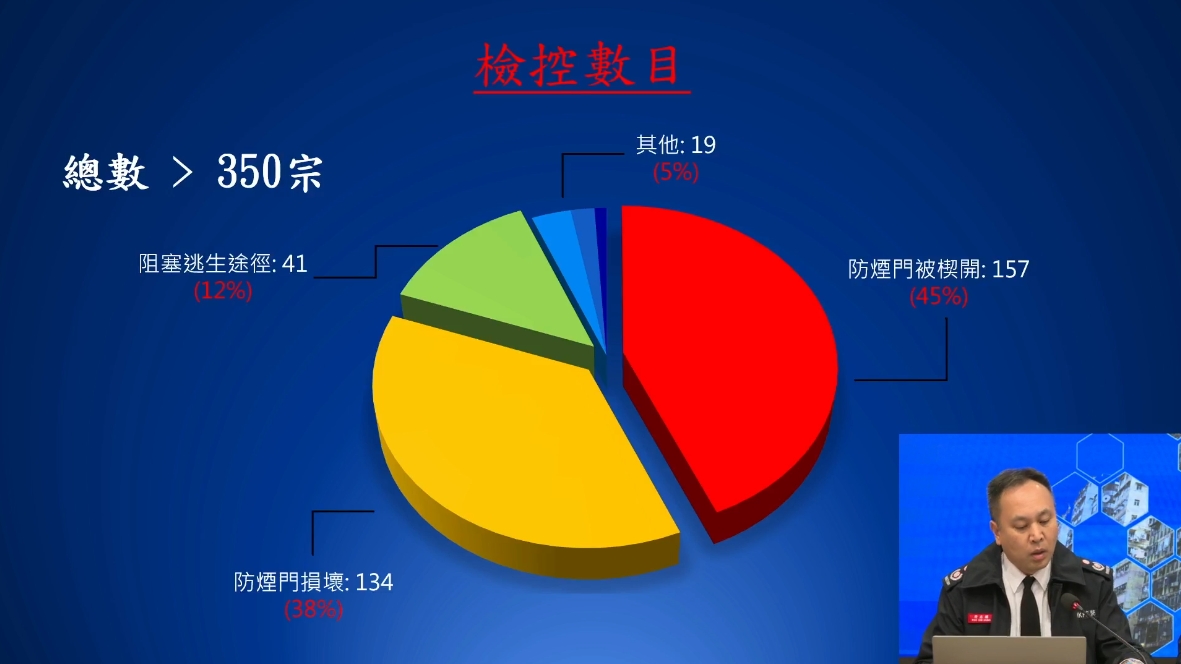另外,消防處已檢控超過350宗到期而未遵辦「通知書」的個案,其中超過八成個案與防煙門違規有關。在已定罪個案中,有18個業主或立案法團因未能遵辦通知書的規定而被檢控,涉及16幢樓宇,共罰款超過14萬元。其中一宗個案涉及大廈內有多道防煙門被楔開,向業主立案法團發出超過20張傳票、罰款超過33000元。