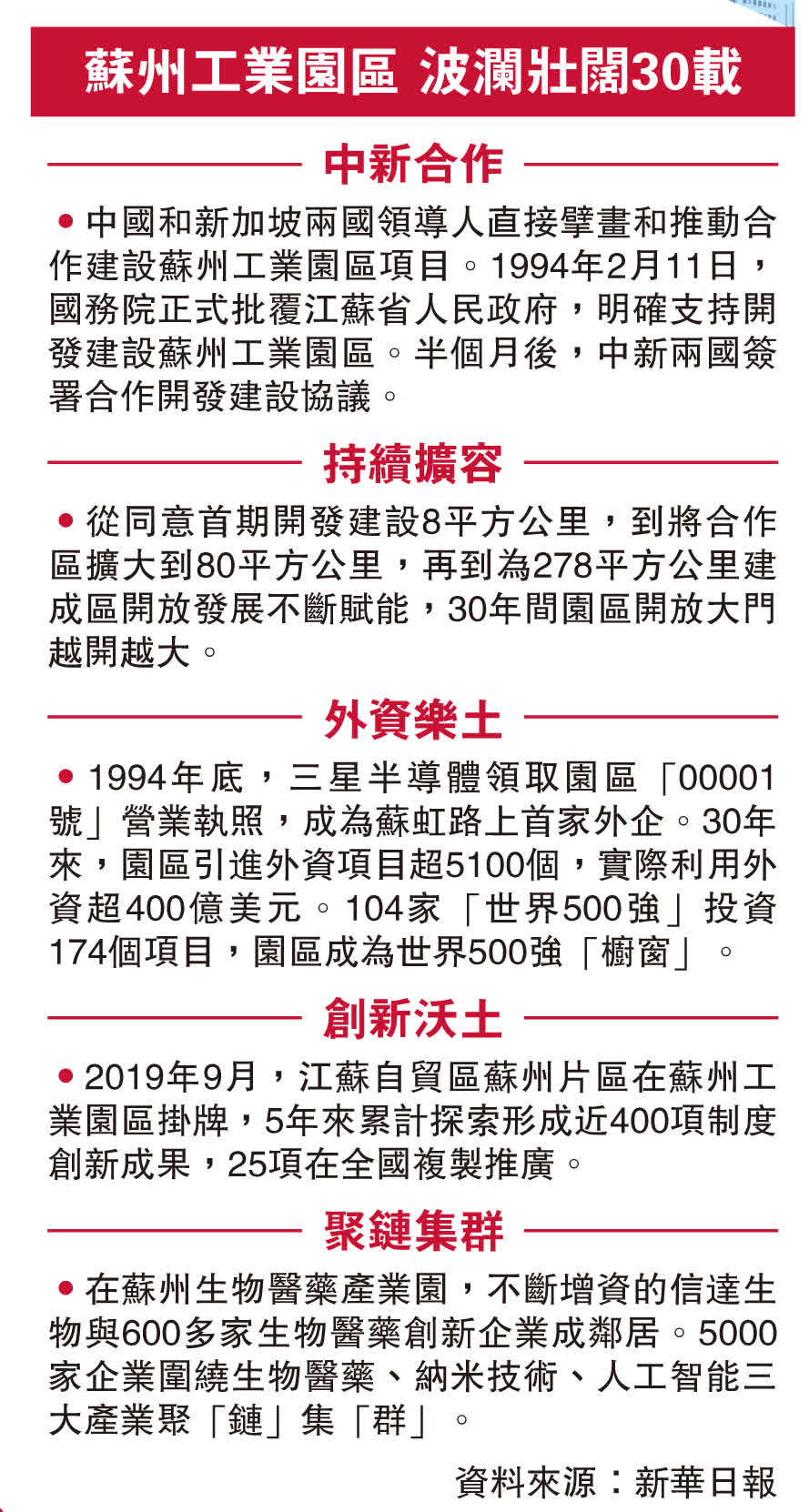 1994年2月,中國和新加坡兩國政府在北京簽署協議,決定合作開發建設蘇州工業園區,開創了國際合作開發產業園區先河。同年5月,蘇州工業園區在金雞湖畔破土動工。園區創立之初,借鑒新加坡和國際先進城市規劃建設經驗,秉承適度超前原則,「先規劃後建設、先地下後地上」,高標準編製總體發展規劃。雖然園區首期開發面積只有8平方公里,但提前對70平方公里土地進行了統一規劃。