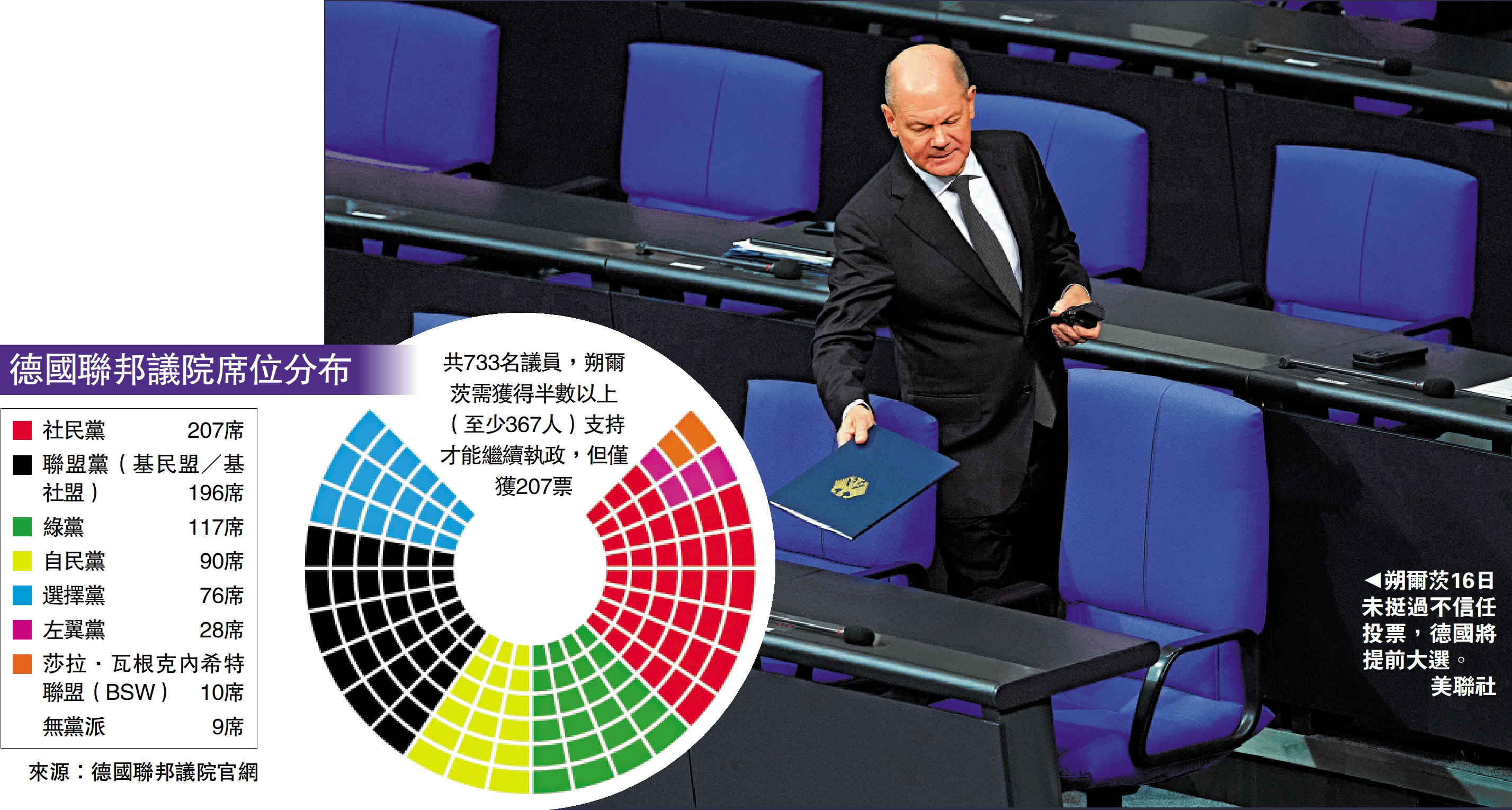 朔爾茨上月解除自民黨主席林德納的財政部長職務,自民黨隨即宣布退出和社民黨、綠黨共同組成的「紅綠燈政府」,朔爾茨政府自此淪為「少數派政府」。本月16日,聯邦議院對朔爾茨發起不信任投票。聯邦議院共有733名議員,朔爾茨需獲得半數以上(至少367人)支持才能繼續執政,但16日只有207名議員投票支持朔爾茨。目前,朔爾茨所屬的社民黨擁有207個議席,由基民盟和基社盟組成的最大在野黨聯盟黨有196席,綠黨有117席,自民黨有90席,極右翼政黨選擇黨有76席。