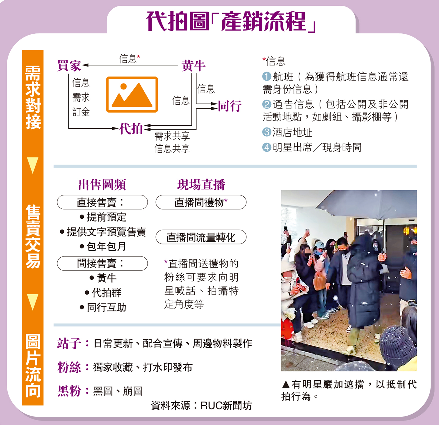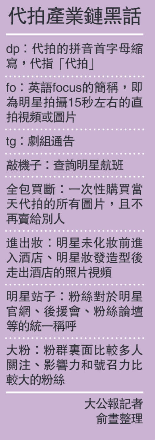 (大公報記者 俞晝)「接敲機子,手快嘴嚴」「接XX到達dp,可圖可fo可視頻」大公報記者在潛入內地某代拍群後,每天都能刷到諸如此類的行業黑話。「敲機子」代指「付費查詢明星航班信息」,「dp」即「代拍」,「fo」即「focus直拍」……從明星行程跟蹤到代拍賣圖牟利,每個環節都有其專屬暗語。「黃牛」倒賣信息,代拍現場拍攝,「粉絲」一擲千金,一條市場龐大、隱蔽性高的產業鏈逐漸支撐起這片粉絲經濟的灰色地帶。「15元(人民幣,下同),一杯奶茶的價格,就能買到劇組通告。」公眾人物的每一次曝光,都成為了明碼標價的「生意」。