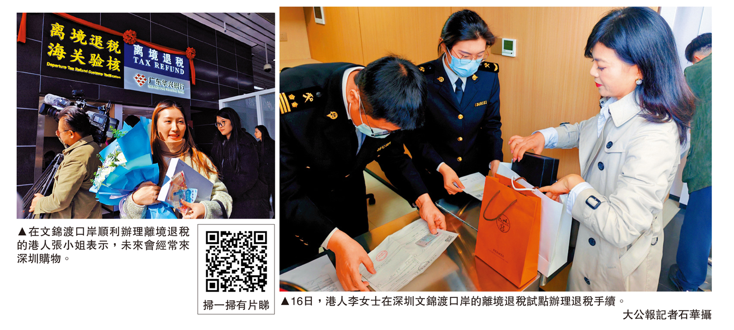 (大公報記者 石華、李望賢 深圳報道)16日,深圳首個離境退稅陸路口岸試點在文錦渡口岸啟用,境外旅客辦理離境退稅業務不必再到寶安國際機場與蛇口郵輪母港進行,深圳也成為大灣區首個擁有海陸空全類型離境退稅口岸的城市。