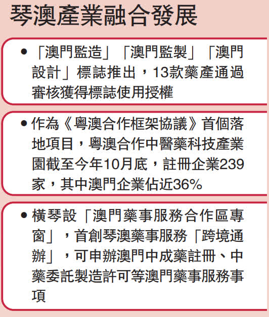 作為《粵澳合作框架協議》首個落地項目,粵澳合作中醫藥科技產業園到今年10月註冊企業達239家,其中澳門企業佔近36%;並逐步形成「澳門監製+橫琴生產」創新模式。而澳門藥事服務合作區專窗也已在橫琴啟用,首創琴澳藥事服務「跨境通辦」。此舉不僅實現企業民眾「足不出境」即可辦理跨境事務,還進一步促進澳門橫琴中醫藥融合發展,亦為粵港產業創新合作與規則銜接提供借鑒。