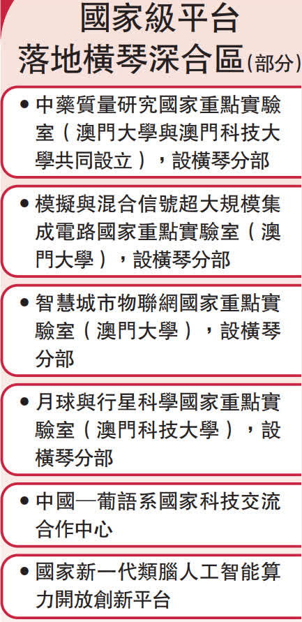 香港菁英會永遠名譽主席、珠海市政協委員鄭重科建議,橫琴、澳門政府給予科技企業更多支持,助力科技企業透過橫琴「走出去」。譬如,可針對符合條件的澳資科技企業,專供相關項目扶持,在扶持政策方面亦可進一步優化。他身邊有企業已跟澳門高校展開項目產學研合作,但「澳門平台+國際資源+橫琴空間+成果共享」模式仍要進一步深化,他建議澳門、橫琴政府仍要加大力度支持和投入,促進科研項目實現成果轉化,打造一批成功的企業或項目案例,並將這些案例對外推廣,形成「澳門平台」的知名度。