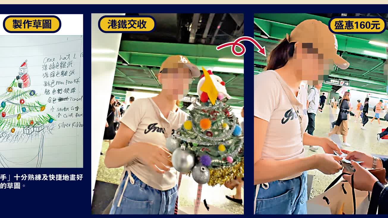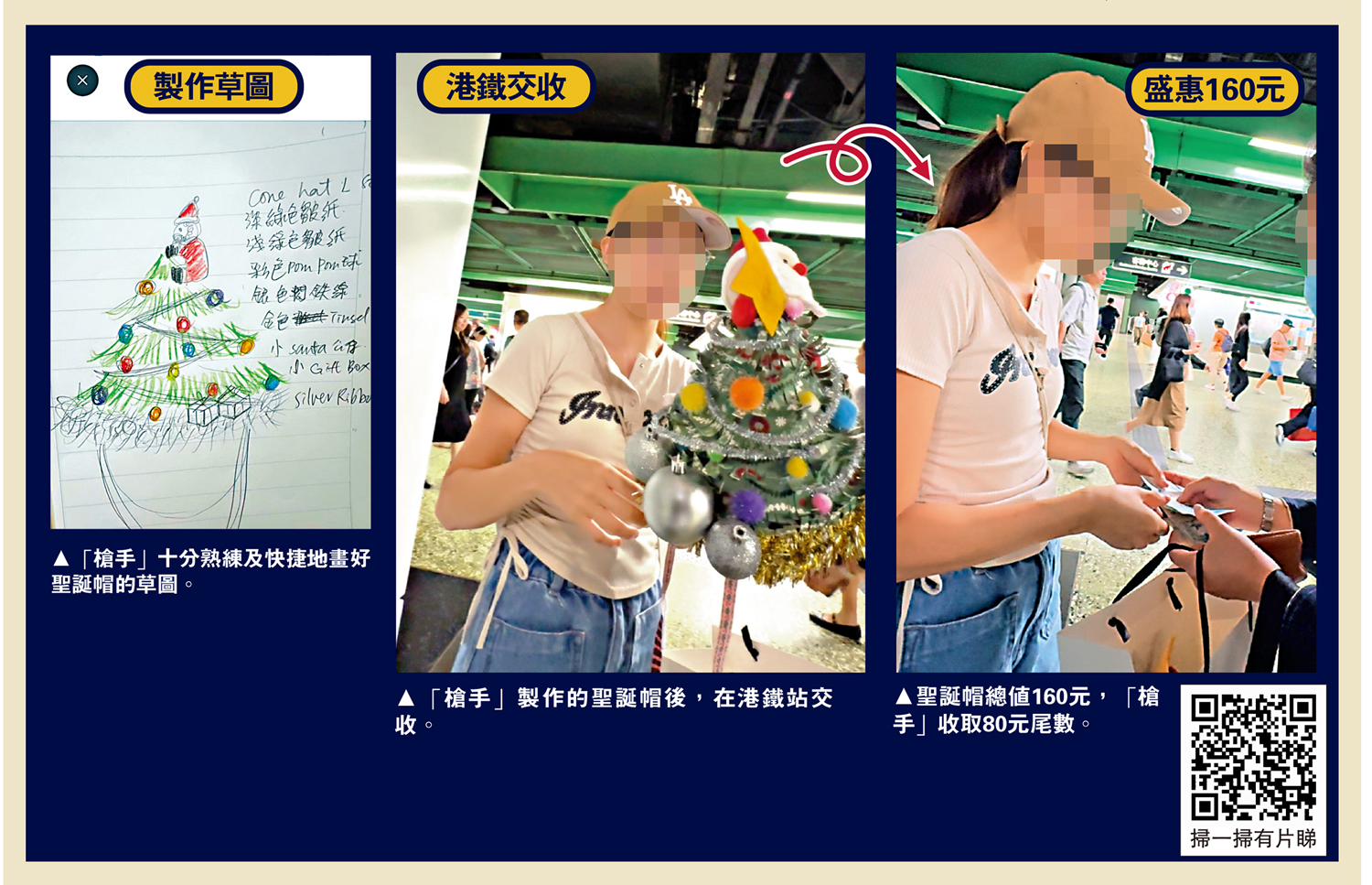 該賣家如期在第三個工作日交貨,同時附上文字:「材料使用環保的聖誕花紙和聖誕裝飾品;將整棵聖誕樹戴在頭上,希望同學遠遠能夠看見,一同感受熱鬧的聖誕氣氛。」記者相約賣家在港鐵站交收,前來交貨的是一名約30歲的女子,她再三溫馨提示記者,該聖誕帽子主要以雙面膠紙及熱熔膠槍黏合,提醒不要大力向上拉扯,如萬一有部分位置鬆脫,可自行利用熱熔膠黏合,並指「用熱溶膠黏合其實已經好實淨。」