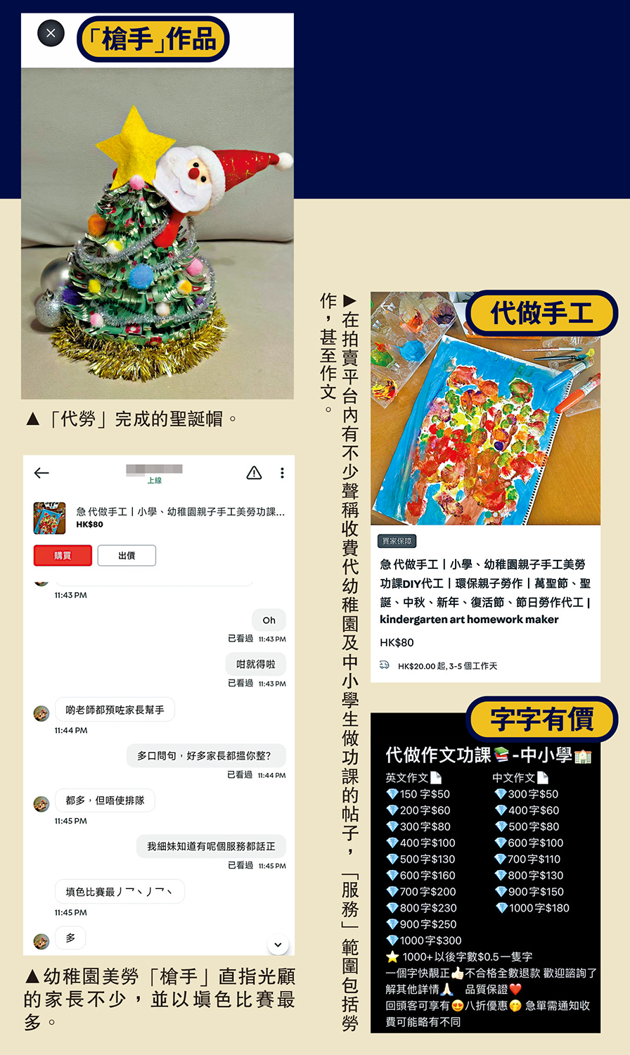 當記者先繳付80元訂金,一小時後,對方已畫好一張聖誕帽的草圖,並要求記者給予意見,其間還提供詳盡專業建議,並指如要另加裝飾的燈帶需額外加多40元,又提醒家長「一個稿可以改三次,多過三次當重新起稿加80元。」賣家自言有不少家長找上門代做該類功課「都多,但唔使排隊」,並指家長要求替子女做的功課「最多是填色比賽」,而相關收費是180元至240元不等,被問到如此做會否有欺騙成分,對方則指「啲老師都預咗家長幫手。」